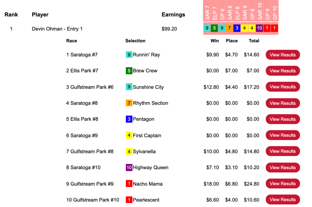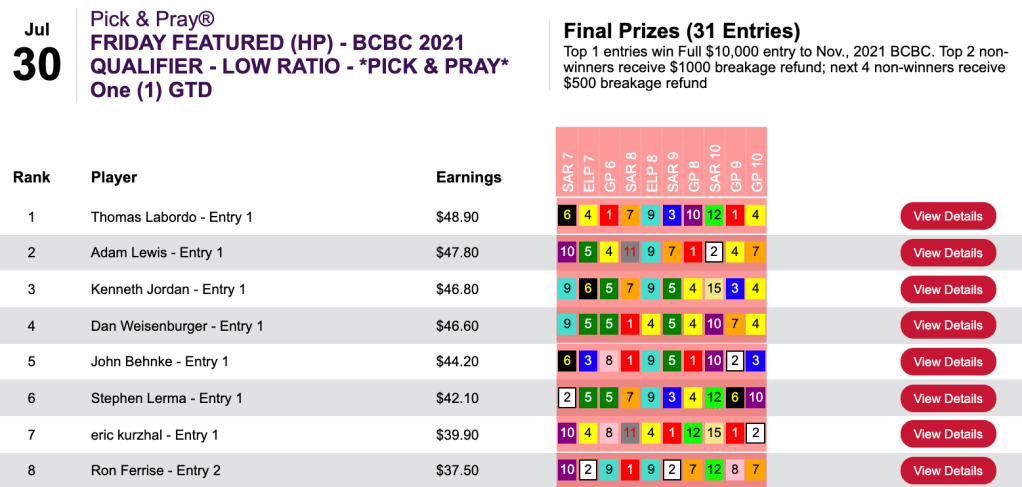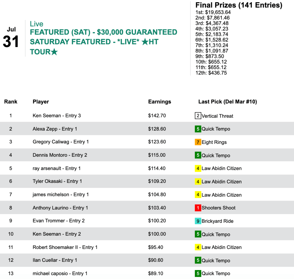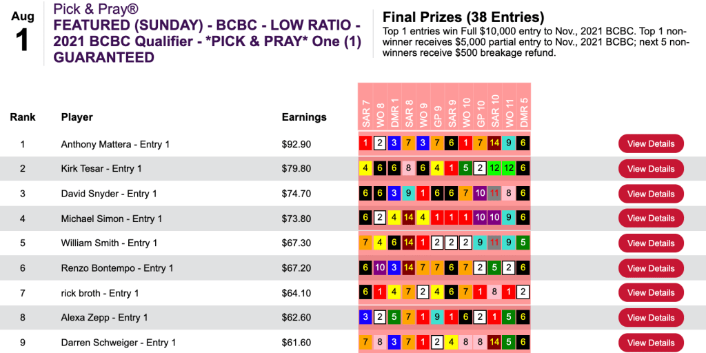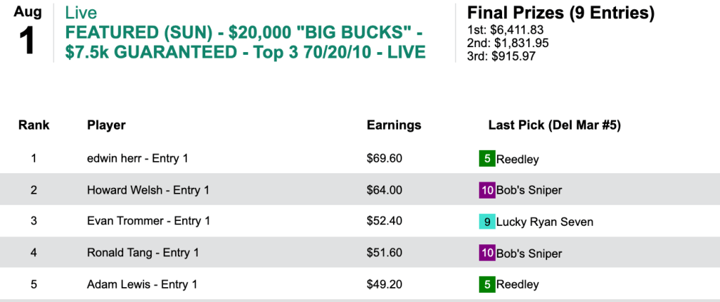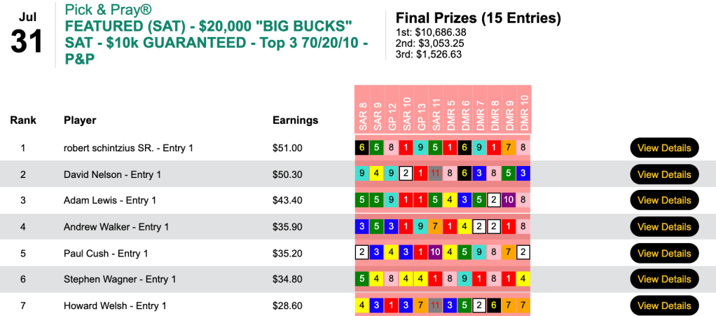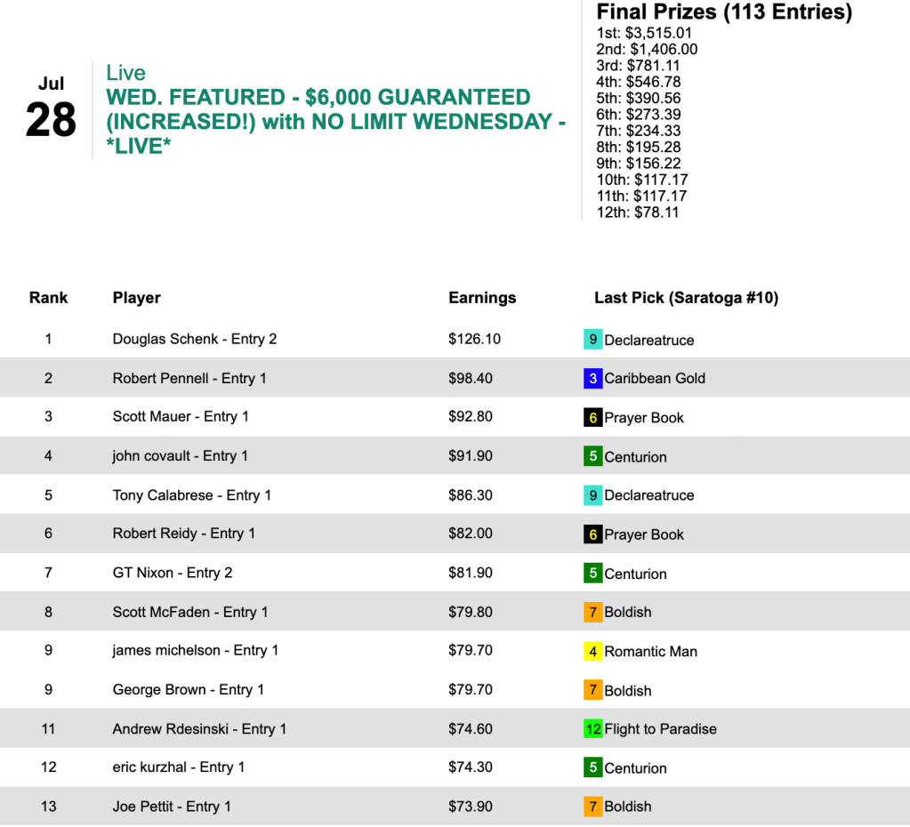Kudos to Pete Manzo (6 wins, 1 place) who rolled home by $32.70. Also picking up $500 entries were Lucas Van Zandt (4W, 1P) and Joseph Costello (3W, 2P).