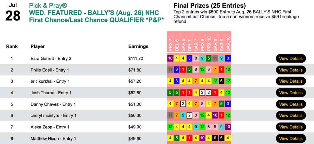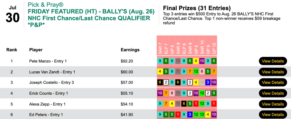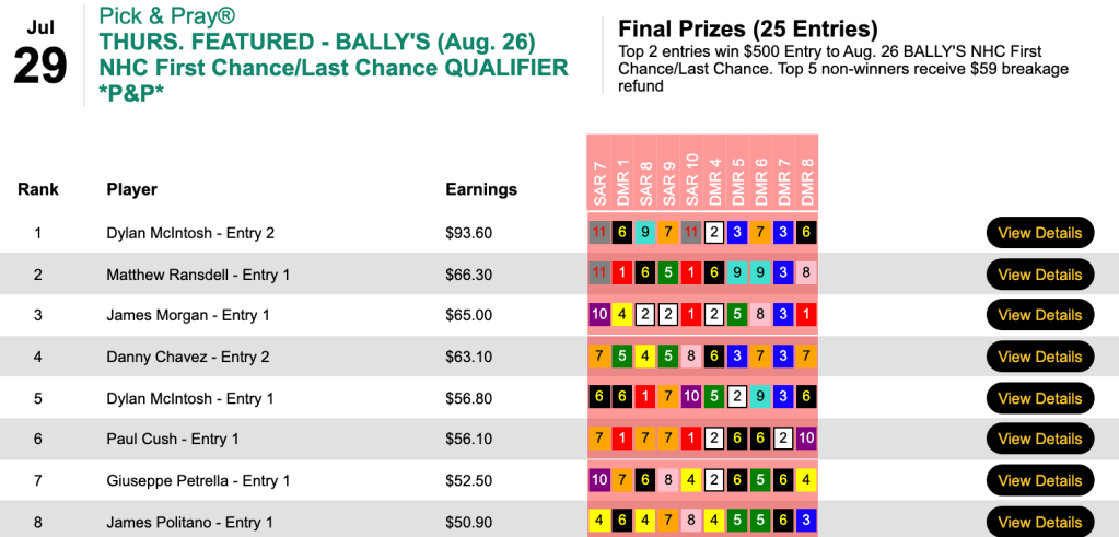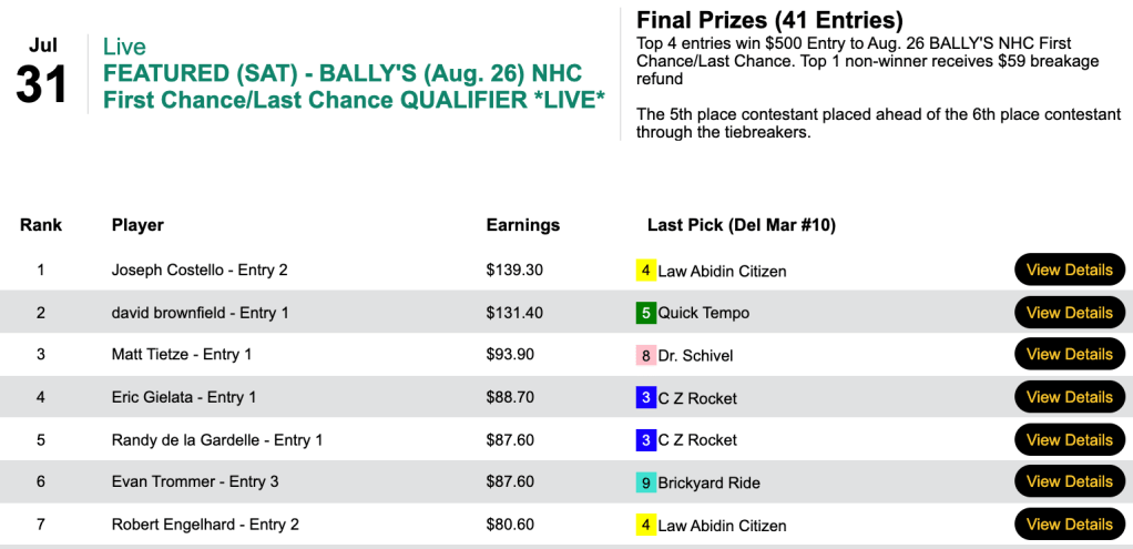 This time he finished first with an imposing score of $139.30 to claim his second Bally’s entry in as many days. Joining Costello in the NHC Eve field will be the second-, third- and fourth-place finishers David Brownfield, Matt “The Fly” Tietze and Eric Gielata.