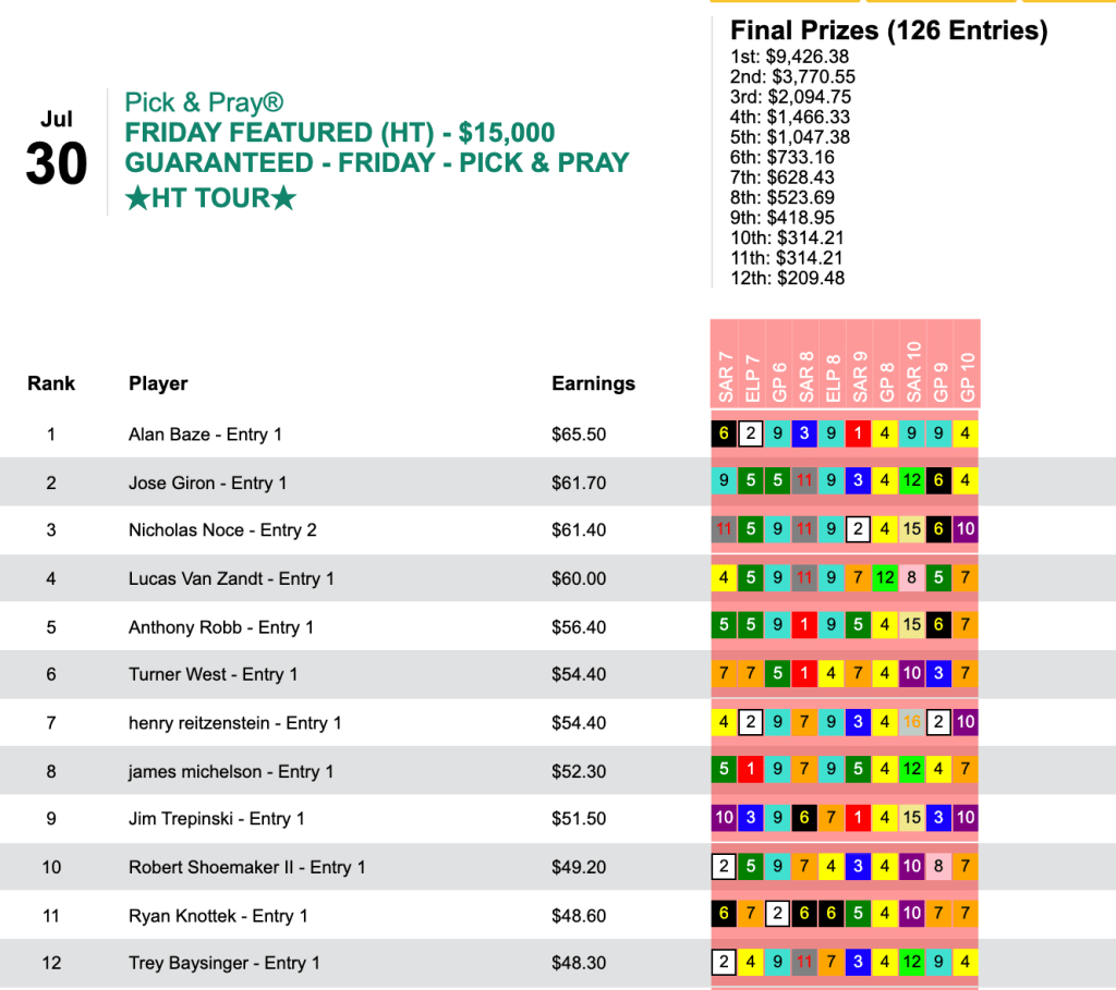 Just seven days after winning $9,127 in the first Friday featured cash game of the 2021 HT Tour season, Baze hit the Friday cash register for another $9,426 in taking this past Friday’s $15,000 Guaranteed Pick & Pray, which closed with a purse of $20,948. In addition to the $9,426 in earnings from the tourney, Baze received an additional $500 as a bonus for winning his second Friday featured cash game.