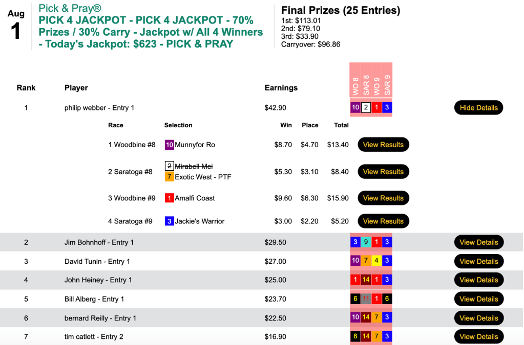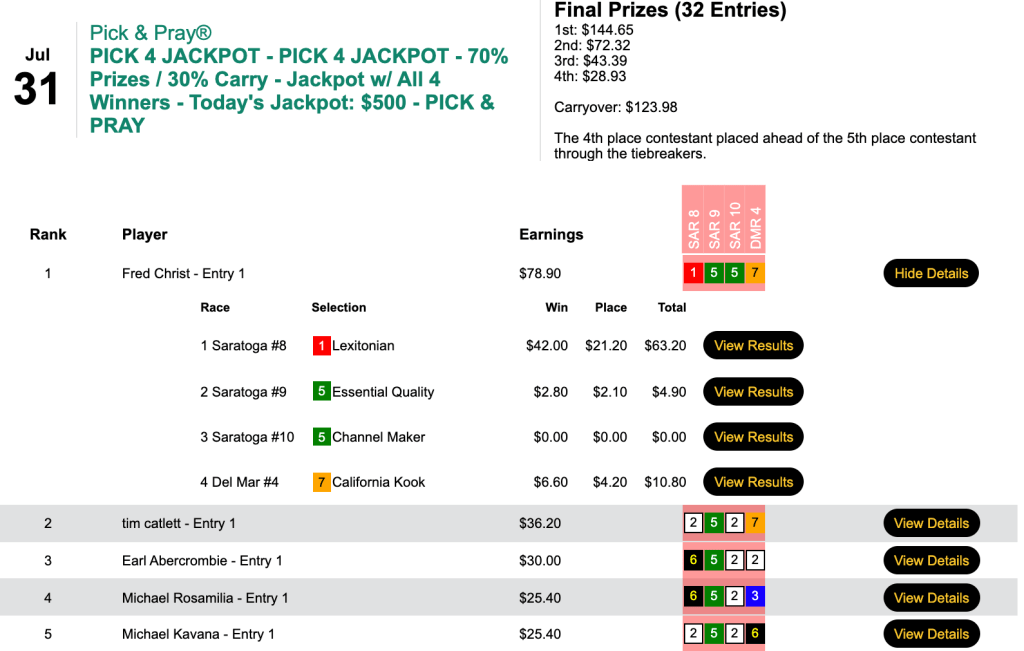 Fred Christ was the only player alive after Lexitonian took leg 1 at 34-1…and he almost pulled off the sweep, only missing on Cross Border in the Bowling Green. That meant a carryover of $623 into Sunday’s Pick 4 Jackpot.