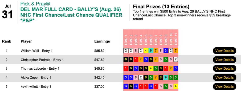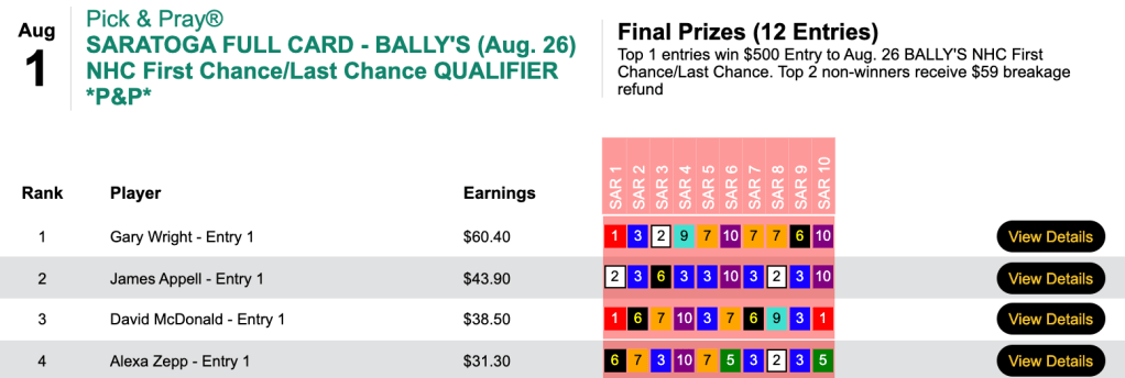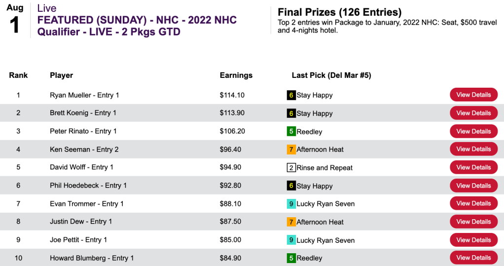 Those 6 wins and a place, made possible by a very strong finish, earned Ohman a cut-rate 2022 NHC spot in Friday’s $75 qualifier at HorsePlayers.