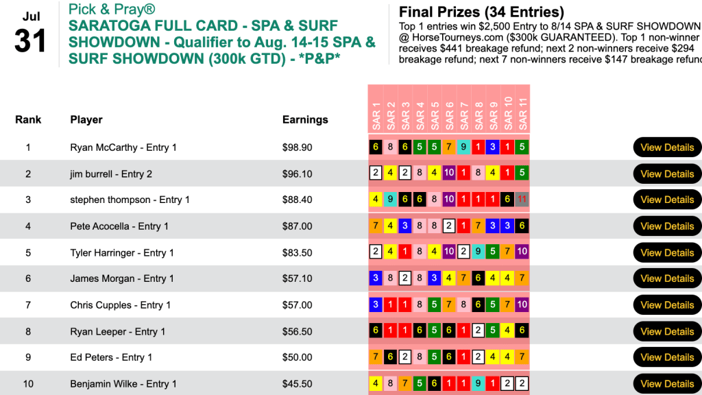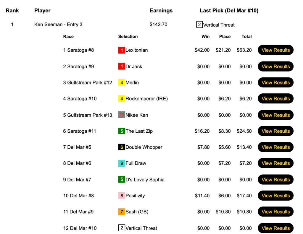Ryan McCarthy captured the full-card, Saratoga-only game thanks to 3 winners that included Lexitonian (34-1) who came up the rail in the Vanderbilt Handicap and The Last Zip (7-1) who won, appropriately enough, the last race.