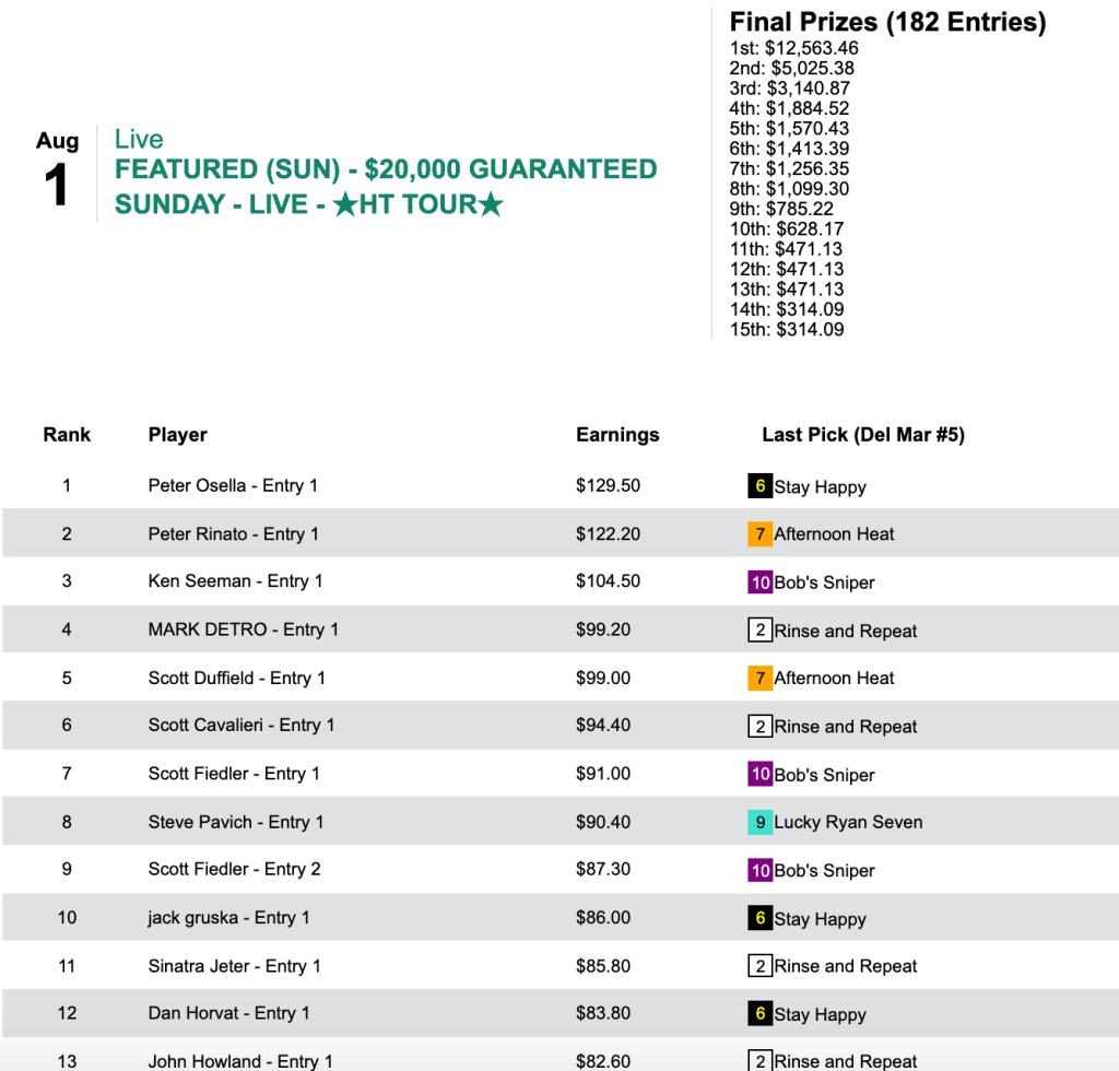 Osella turned those 5 wins and 3 places (including Stay Happy in the final race) into $12,563 in Sunday’s $25,000 Guaranteed cash tourney, which closed with a purse of $31,408.