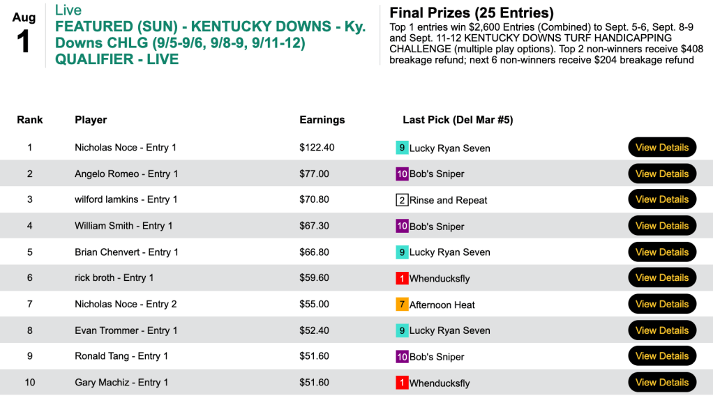 Lawrence Kahlden (3 wins, 0 places) and Rick Vasquez (4W, 1P) put themselves in the running for a windfall on August 14-15. Not one of their eight combined collections were held in common.