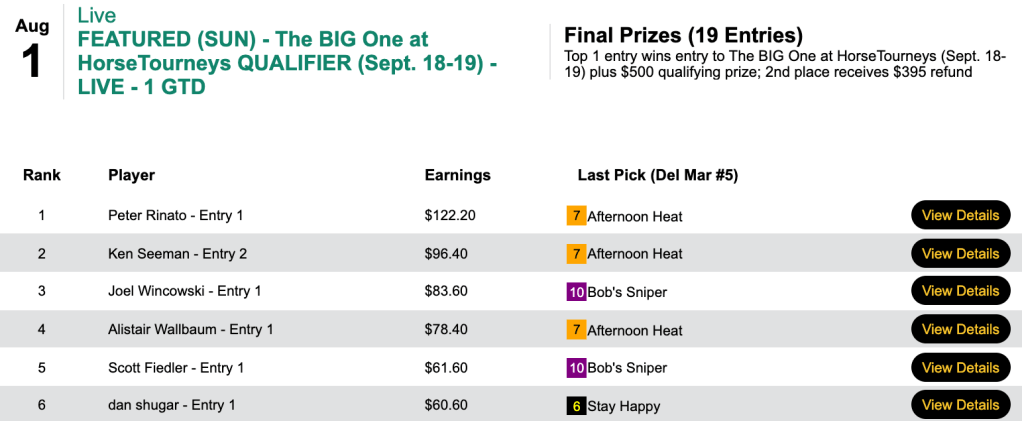 Rinato had I’m Dashing ($24.40, $16.50) as his highest collection among 5 wins and a runner up. As a result, he will be one of no more than 57 in the field for The BIG One—to be held online again this year…right here…on September 18-19.