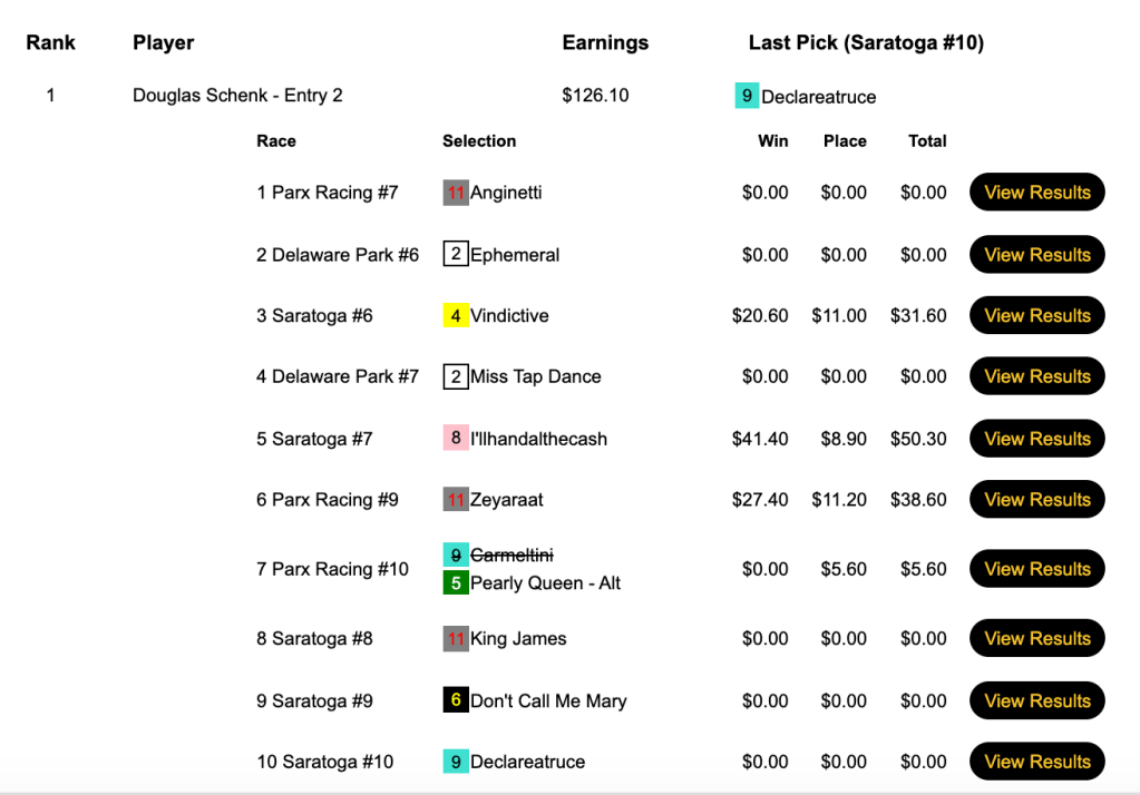 Here, in the Breeders’ Cup Betting Challenge Low Ratio Pick & Pray at HorsePlayers, Mattera doped out 4 winners and a place to earn the $10,000 entry and make it $12,500 worth of seat-value winnings in a 24-hour period. Kirk Tesar finished second to Mattera and grabbed a $5,000 partial BCBC entry.