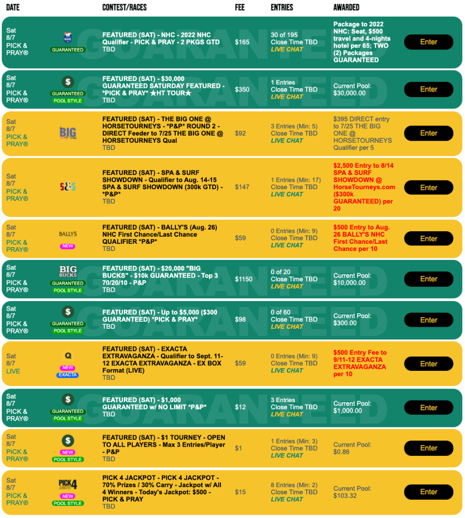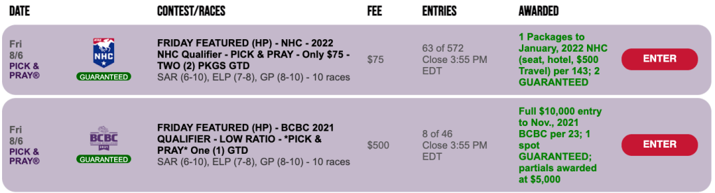There’s also an NHC Pick & Pray right here at HorseTourneys on Saturday. It’s a “regular,” 1-per-65 game with two 2022 seats guaranteed and an entry fee of $165.