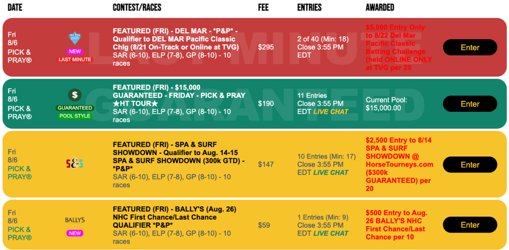 There’s a brand-new qualifier on the Friday schedule: A $295, 1-per-20 Pick & Pray play-in for the August 22 Del Mar Pacific Classic Challenge. Winners earn a $5,000 entry for the live-bankroll contest that may be played on the 22nd at either TVG.com or on-track at Del Mar.