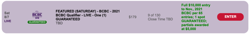 It’s a $179 Live-format play-in. At least one $10,000 BCBC entry is certain to be going out the door, and the winning ratio is 1-per-65.