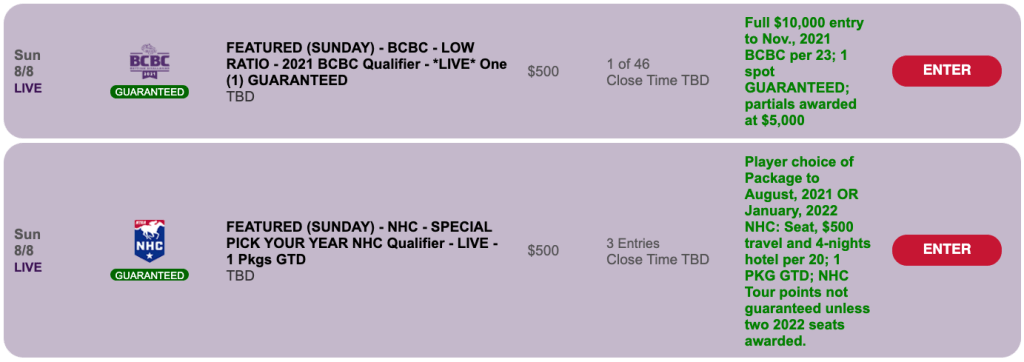 The only Live-format on the Sunday HT featured menu is our Big Bucks get together. It’s an up-to-$20,000 tourney with $7,500 Guaranteed and an entry fee of $1,150. Entries are limited to 20, and payouts go solely to the first three finishers.