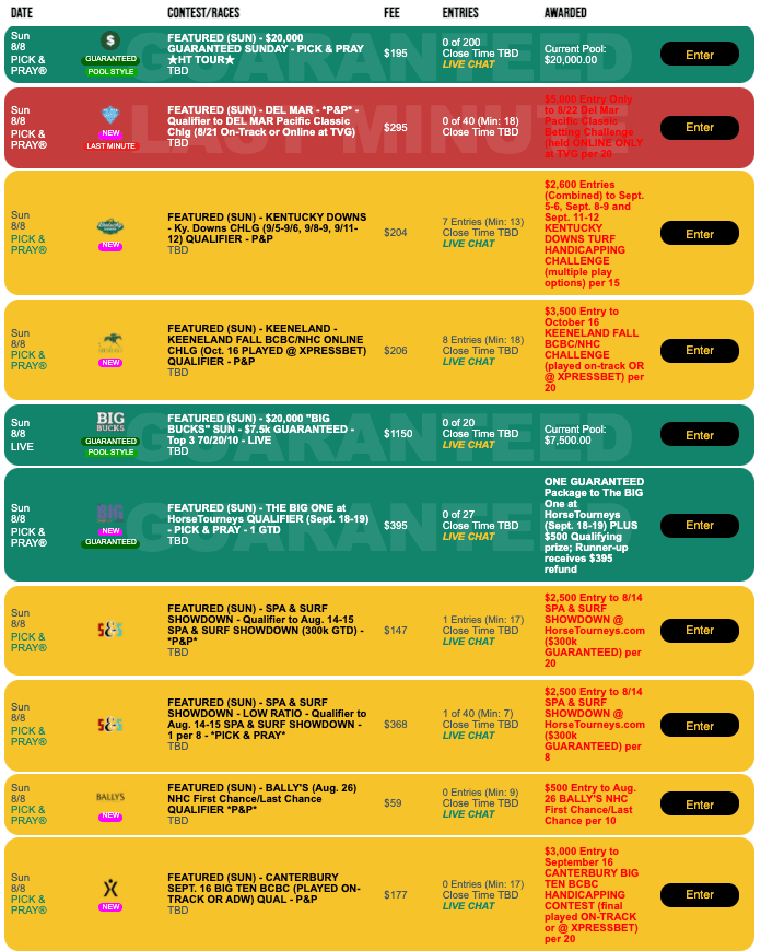 A Pick & Pray qualifier to the October 16th Keeneland Fall BCBC/NHC Challenge is also on the Sunday slate. This one has an entry fee of $206 and a winning ratio of 1-per-20. Winners get a $3,500 entry to the fall contest, which can be played either on-track or at Xpressbet.