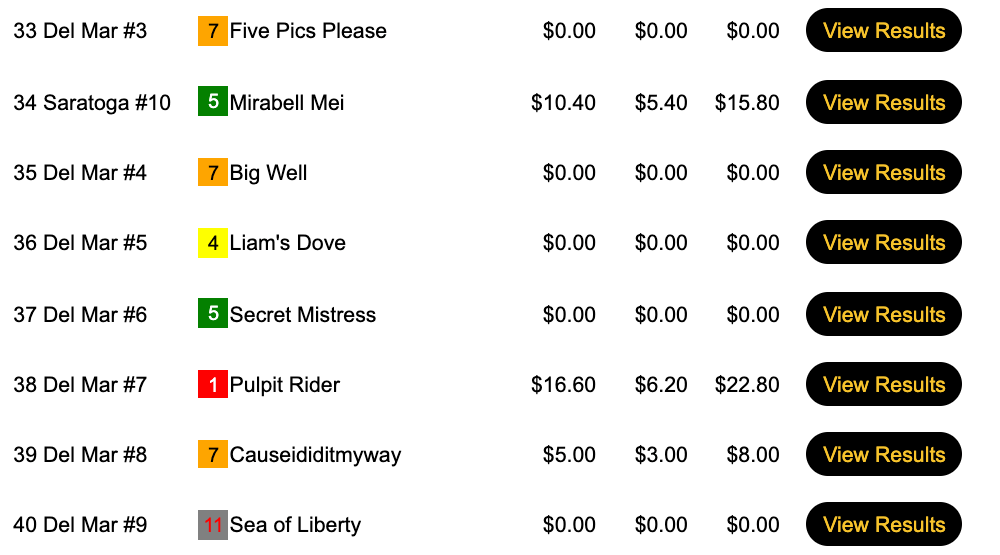 Perhaps the single biggest factor in Miller’s victory is that he had the weekend’s three highest paying winners: Flint Ridge ($25.40) in Saturday’s race 2 at Saratoga, Got Stormy ($27.00) in Saturday’s 10th at the Spa and Gimmick ($26.60) in Sunday’s 5th at Saratoga. Miller was no one-track pony, however. His Del Mar winners included Seattle Breakout ($17.60) in Saturday’s 7th and—perhaps most notably—Puipit Rider ($16.60) in Sunday’s 7th. It was a victory that, with just two races remaining, enabled him to take the lead for the first time.