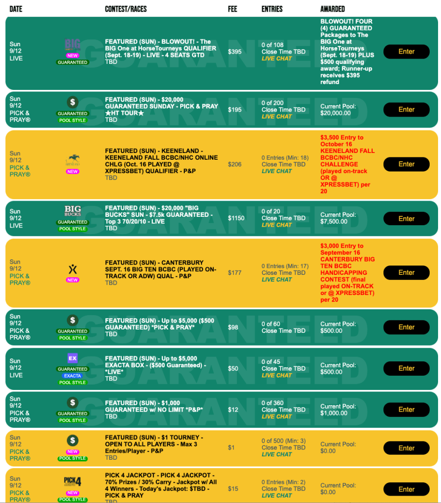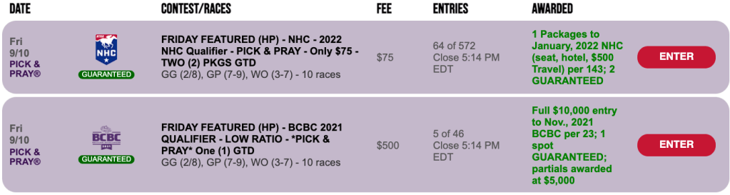 We’ll also have another Keeneland Fall BCBC/NHC Challenge qualifier (a Pick & Pray) on Sunday. It’ll have an entry fee of $206 and a winning ratio of 1-per-20. Winners garner a $3,500 entry to the October 16th tournament.