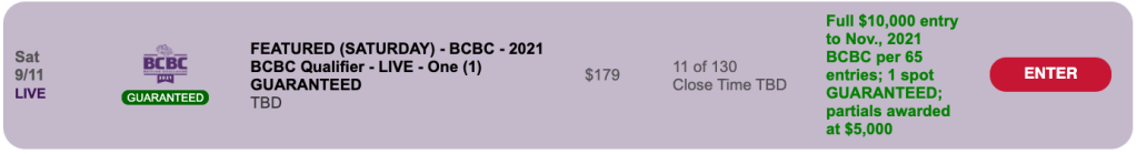 It’s a $179 Live-format play-in. At least one $10,000 BCBC entry is guaranteed, and the winning ratio is 1-per-65.