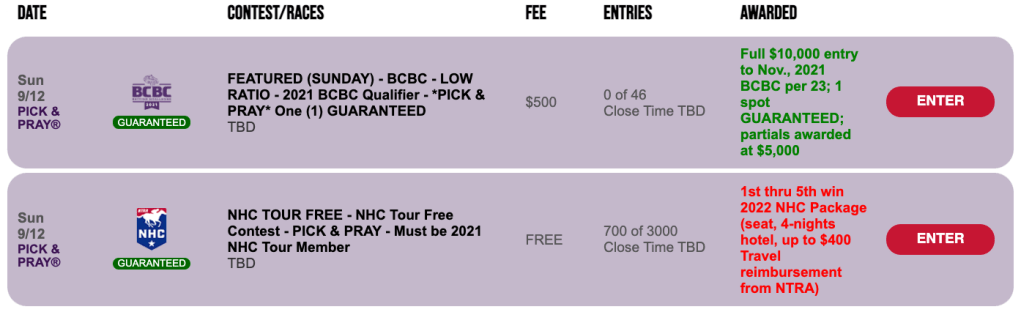 Friday’s $75 NHC Pick & Pray offers two guaranteed spots in the 2022 event plus NHC Tour Points if you finish in the top 10 percent of the field. The winning ratio is 1-per-143. Remember—you must be a 2021 NHC Tour member, prior to the start of the contest, in order to be eligible for an NHC package in this or any other NHC qualifier. If you’re not a member, you can become one quickly and easily at NTRA.com for a $50 membership fee.