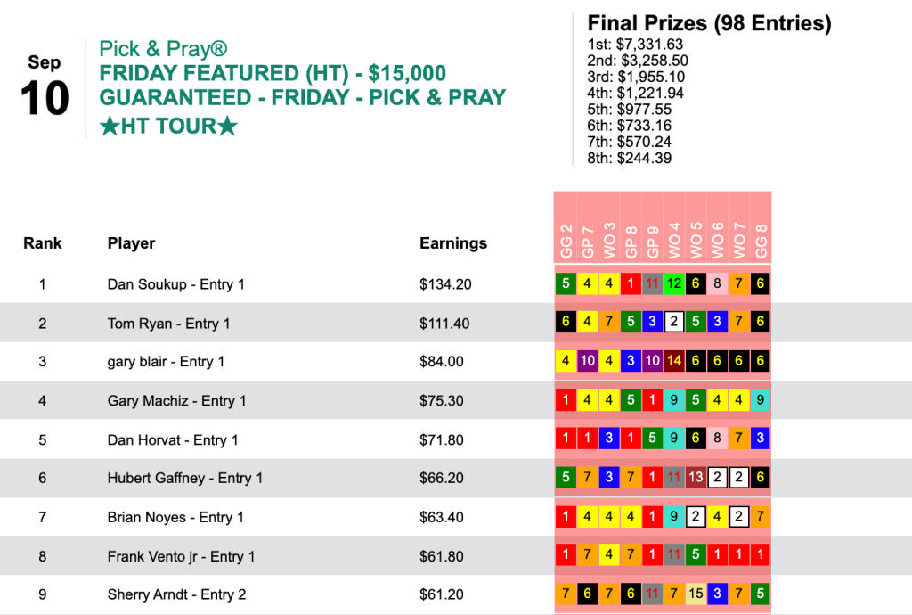 Sticking with the cash-game theme, Friday’s high-score was posted in the day’s HT Tour event, our $15,000 Guaranteed Pick & Pray, by Dan Soukup (no relation to the Tampa Bay Buccaneers kicker).