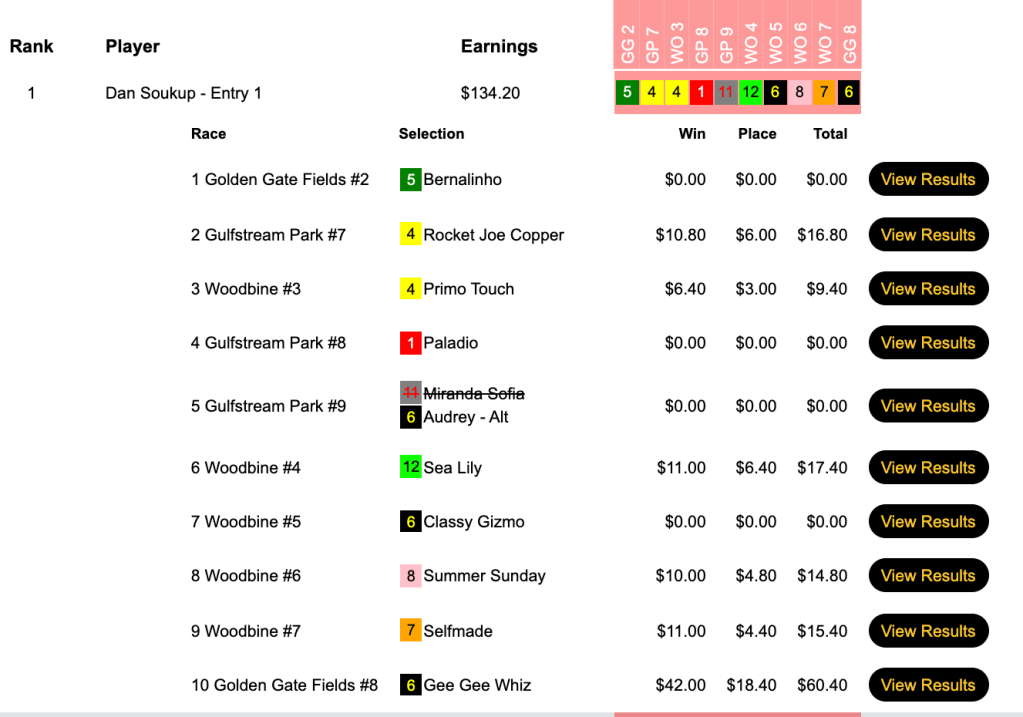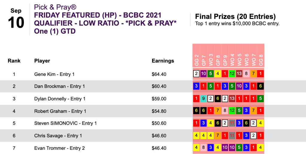 Kim made the low ratios (and the payoff cap) work in his favor in this BCBC qualifier thanks to 4 winners (none of which paid more than $11.00) and two places that enabled him to narrowly top the one player, Dan Brockman, who did have Gee Gee Whiz.