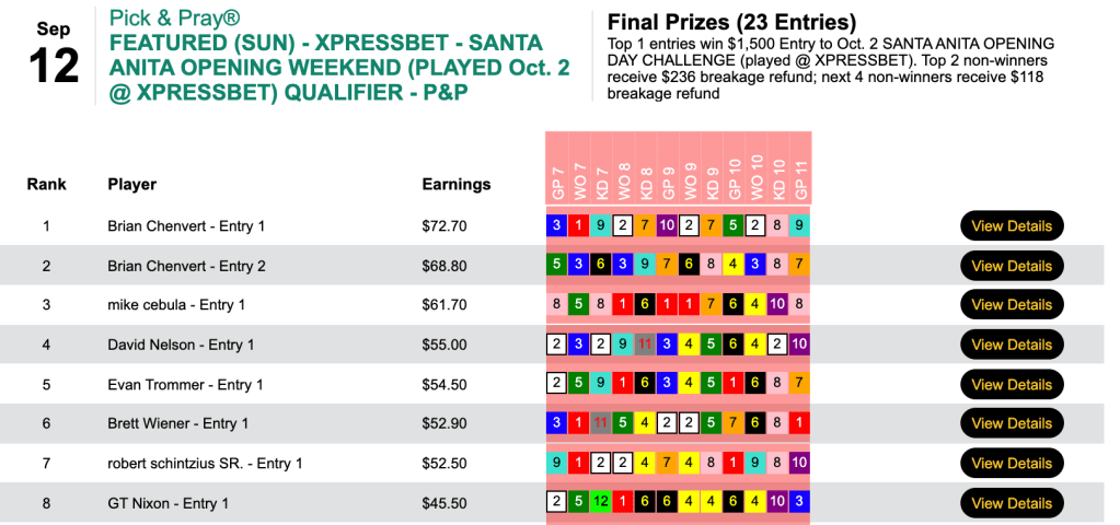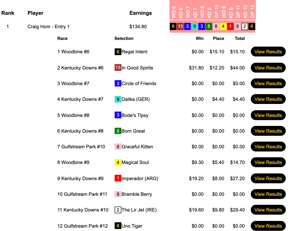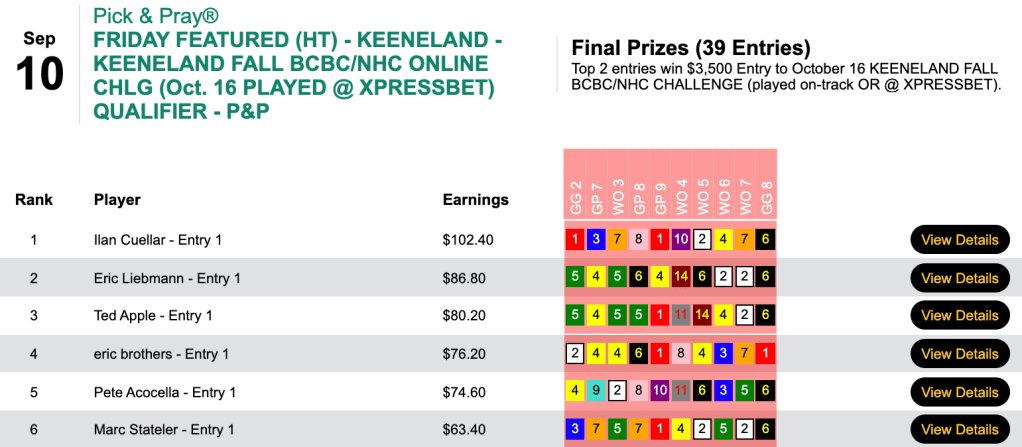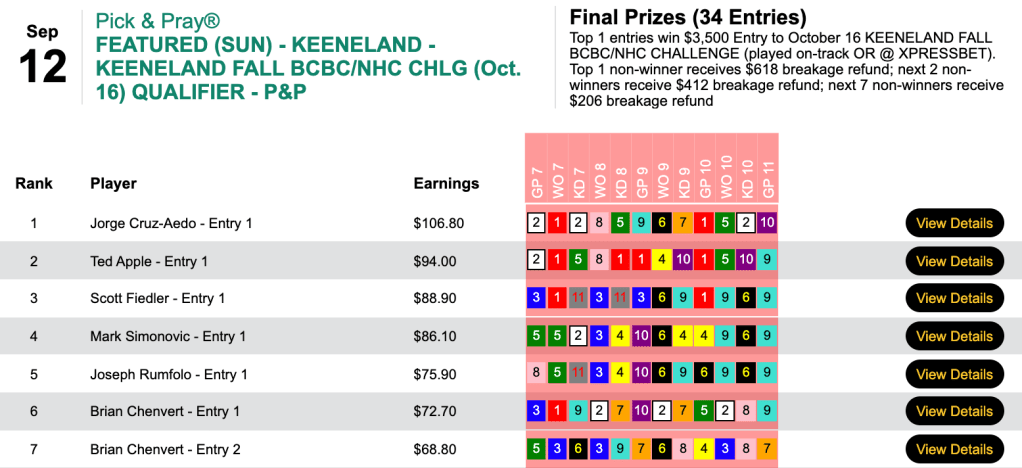 The other featured tourney at HorsePlayers on Sunday was a $500 Breeders’ Cup Betting Challenge Low Ratio Pick & Pray.