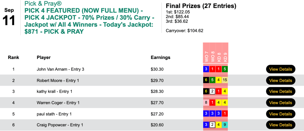 …managed to go 4-for-4 while winning the weekend’s $15 Pick 4 Jackpot tourneys. So that means that next Saturday’s Jackpot will start out with $1,114 in the kitty.