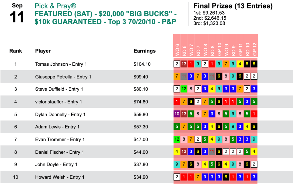 Tomas Johnson (not the former Islanders great) recorded 3 wins and 3 places to garner the top prize here of $9,261. The tourney closed with a final overall pot of $13,230.