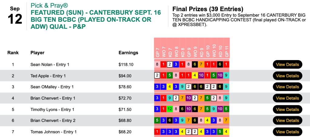 …and in Sunday’s Last Chance qualifier to Thursday’s Canterbury Big 10 BCBC Handicapping Contest.