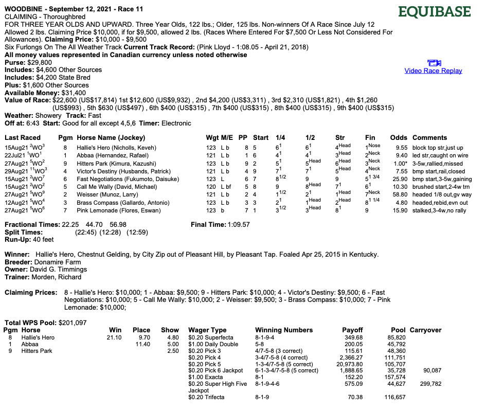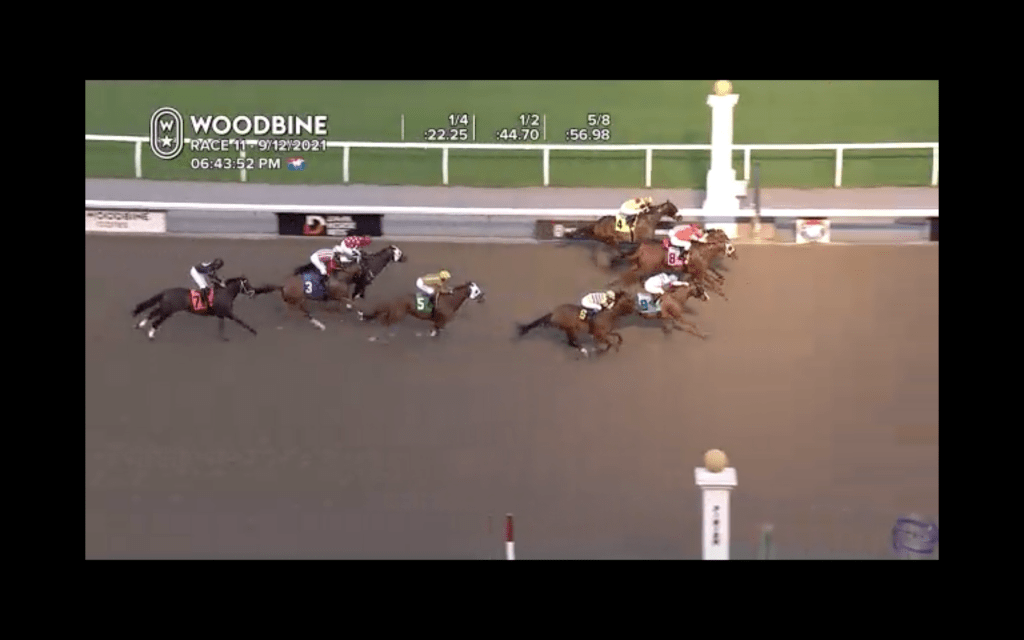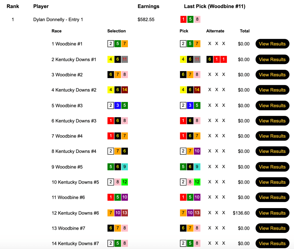 In as contentious a race as you’re ever going to see, Dylan Donnelly, 30, of Alta Loma, Calif., saw two of his three exacta box horses—Hallie’s Hero (9-1) and Abbaa (also 9-1)—prevail in a five-horse blanket finish in the final race of the two-day, $50,000 Guaranteed Exacta Extravaganza, the 11th at Woodbine. The dueling 9-1 shots combined on a $1 exacta payoff worth $152.20, and that propelled Donnelly from 3rd-place to first—a distinction that came with a prize of $20,250.