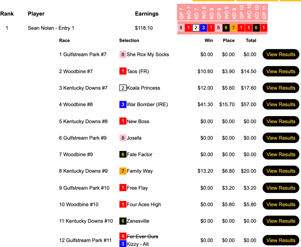 Of course, the $2 win/place scoring system remains our bread and butter, and we had plenty of those featured tourneys to go around last week…starting on Wednesday.