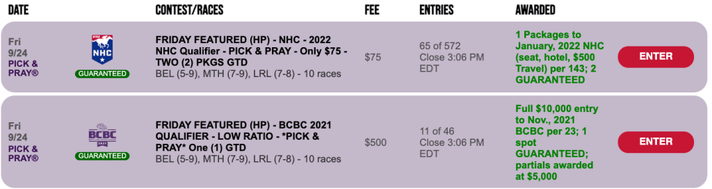 There will be a qualifier a day this weekend to the October 16th Keeneland Fall BCBC/NHC Challenge. Friday’s has an entry fee of $206 and a winning ratio of 1-per-20. Winners earn a $3,500 entry, which can be played on the 16th either on-track or at Xpressbet.