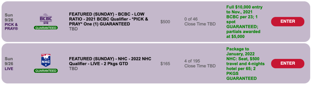 The Sunday Big Bucks tourney is always run in Live format (so that there is one Pick & Pray and one Live Big Bucks game each week). It’s an up-to-$20,000 competition with $7,500 Guaranteed and an entry fee of $1,150. Entries are limited to 20, and payouts go just to the first three finishers.