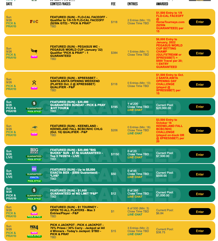 On Sunday, our busiest day, you can participate in any of nine featured events—two at HorsePlayers and seven right here at HorseTourneys.