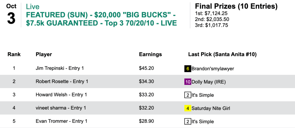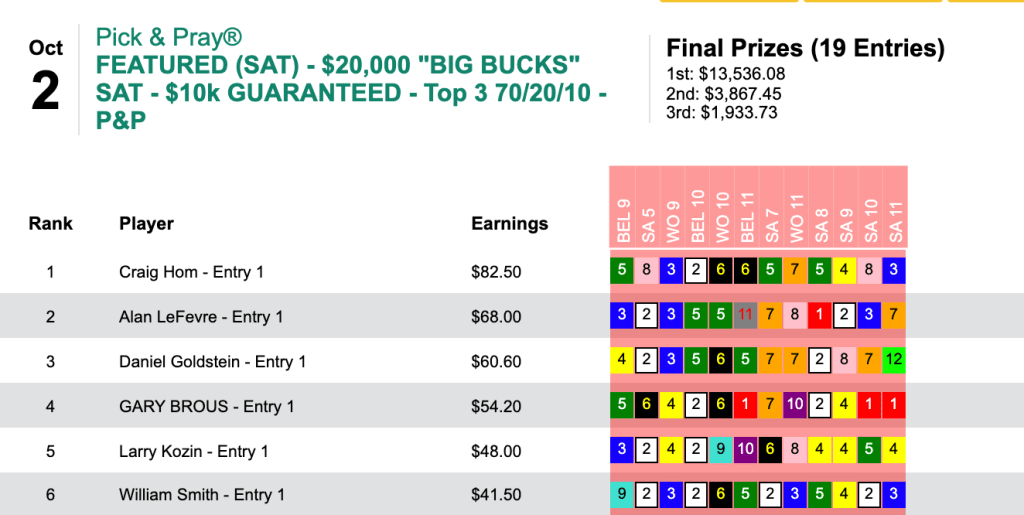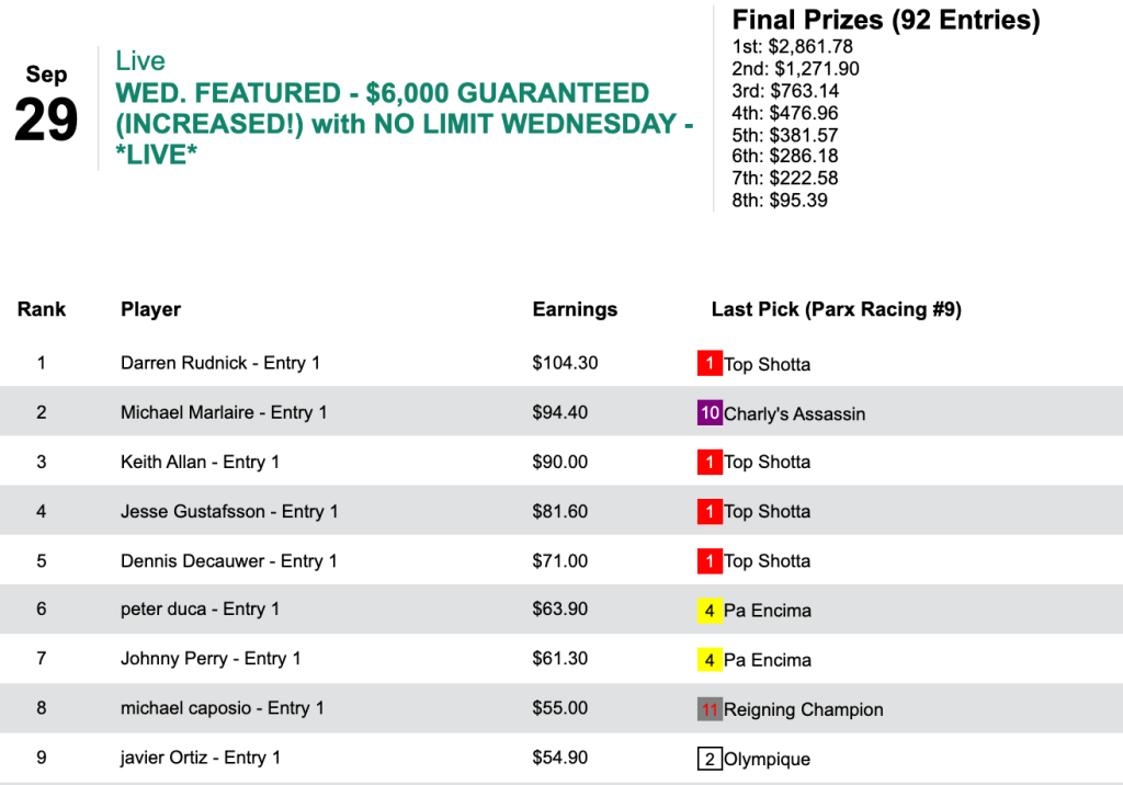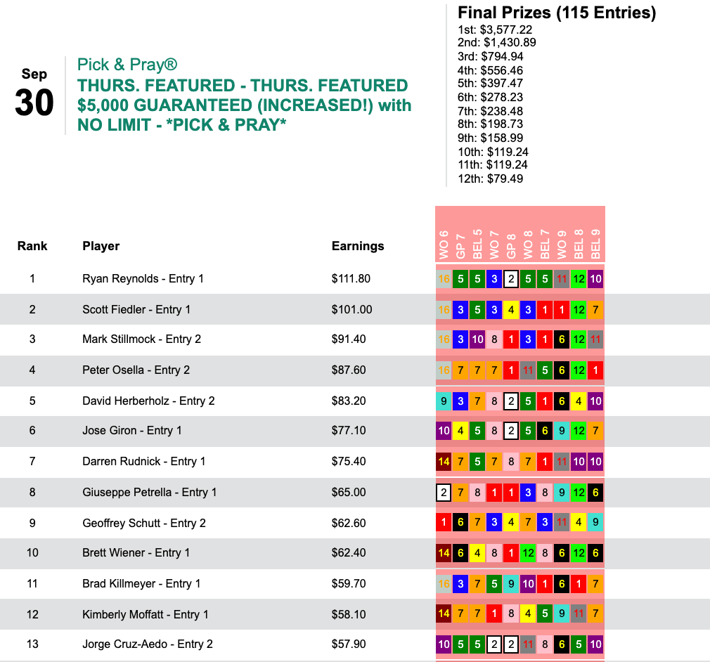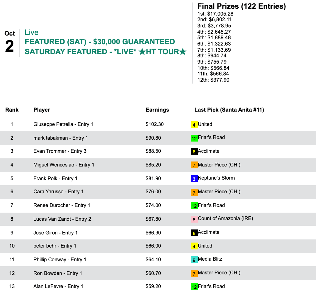 Mike Castagnoli blasted out of the starting gate with 4 winners en route to 6-win, 1-place day that led the way, Not too far behind him was Marc Stateler (3 wins, 4 places). Stateler also picked up a $3,500 entry for October 16th.