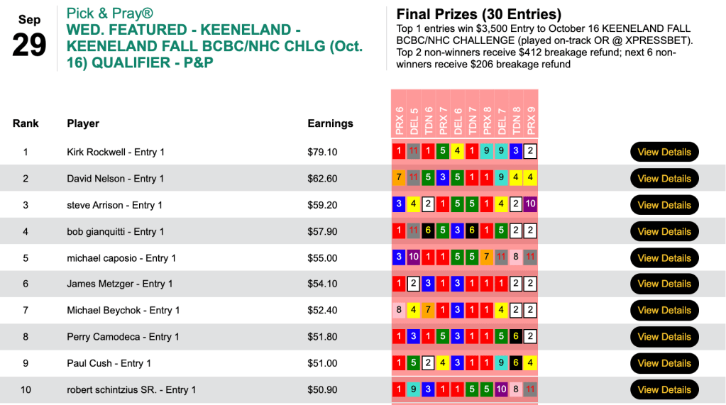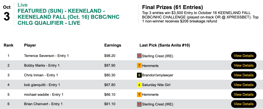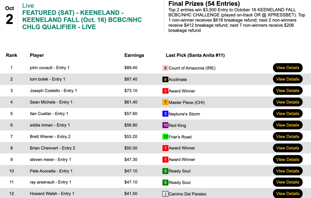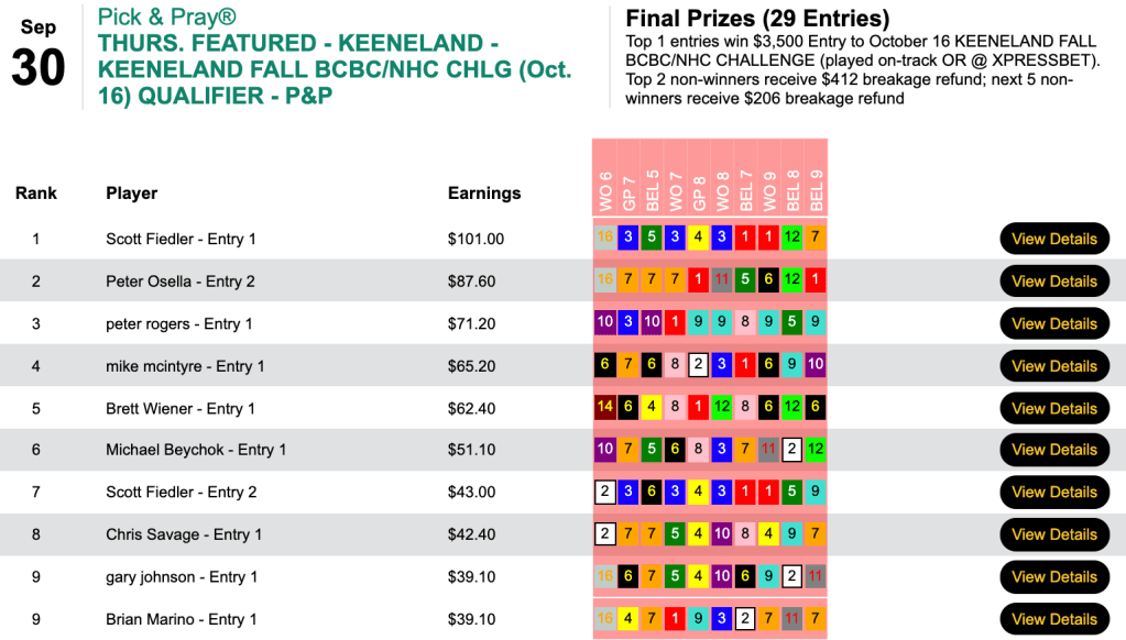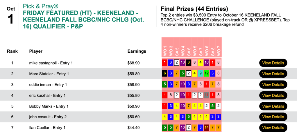 There was also a skillful and successful duo in Friday’s Keeneland Fall BCBC/NHC Challenge Pick & Pray qualifier.