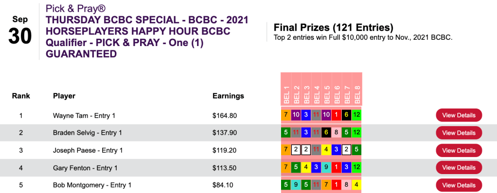 At HorsePlayers on Thursday, there was a special Breeders’ Cup Betting Challenge qualifier on the first eight races of that day’s Belmont card.