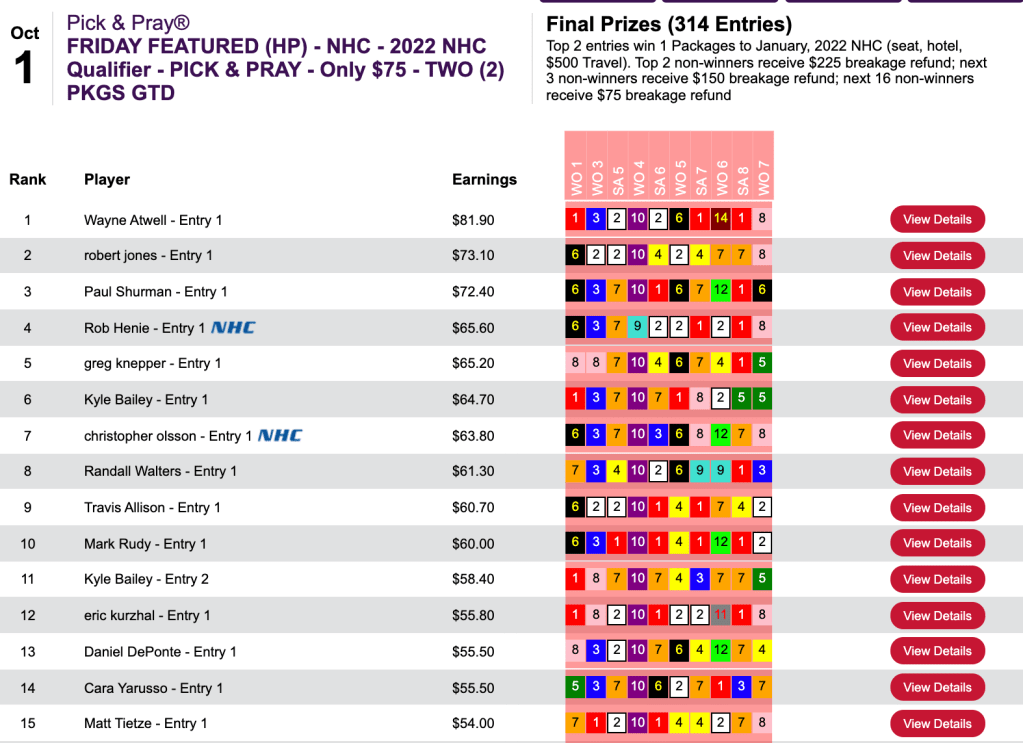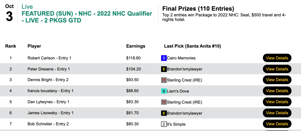 There weren’t a lot of big prices to be had on Friday. The day’s NHC qualifier at HorsePlayers saw Wayne Atwell put up the high Friday score with a tally of $81.90.