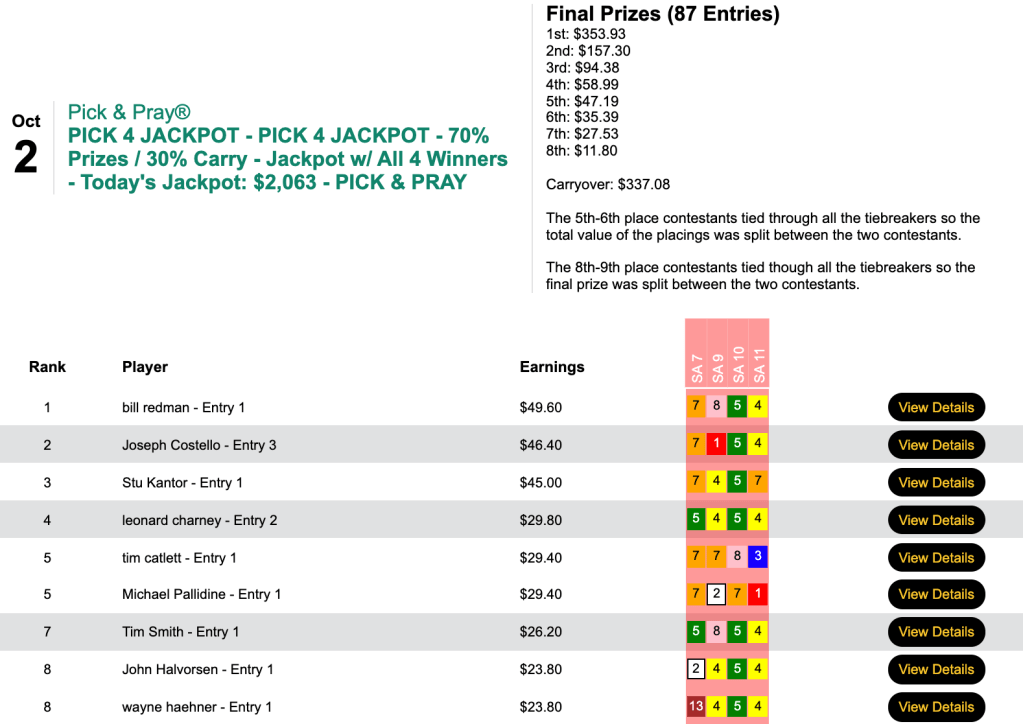 …went 4-for-4 in winning their respective $15 Pick 4 Jackpot tourneys last weekend. So next Saturday’s Jackpot will start out with a carryover of $2,737.