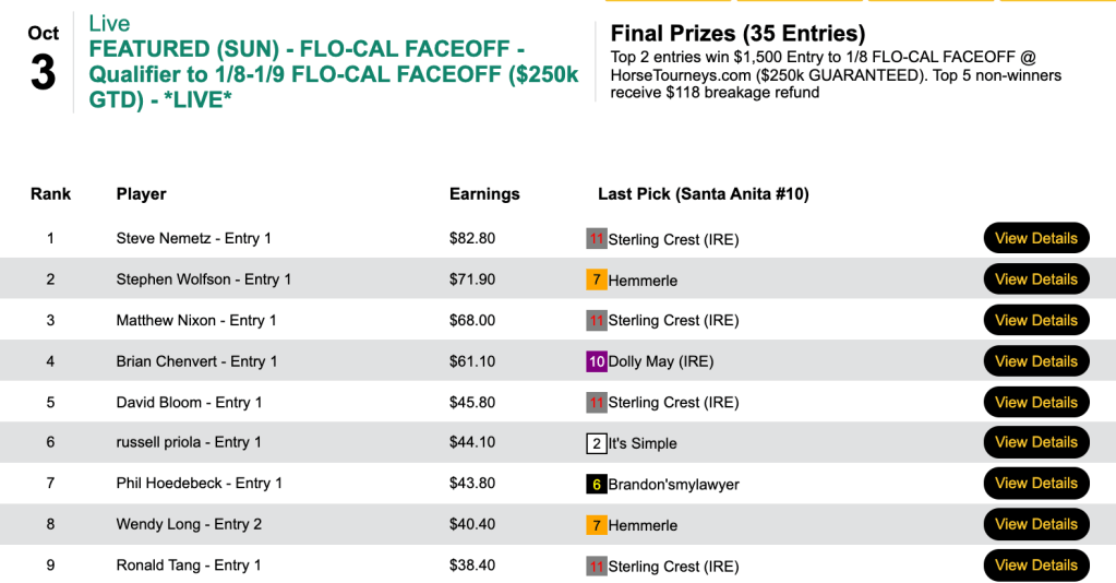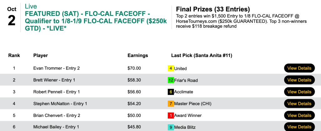 Back here at HorseTourneys, Evan Trommer (5 wins, 2 places) and Brett Wiener (3 wins followed by 2 places) were the recipients of $1,500 Flo-Cal Faceoff entries.