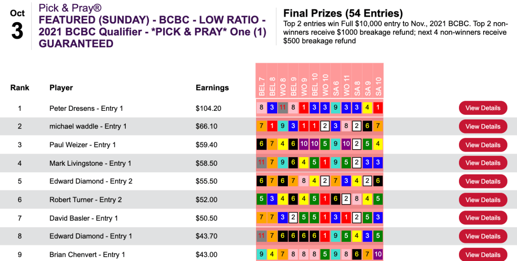 He took those three wins and a place and rode them to victory in Sunday’s Breeders’ Cup Betting Challenge Low Ratio Pick & Pray at HorsePlayers, an event that also saw Michael Waddle pick up a $10,000 entry.