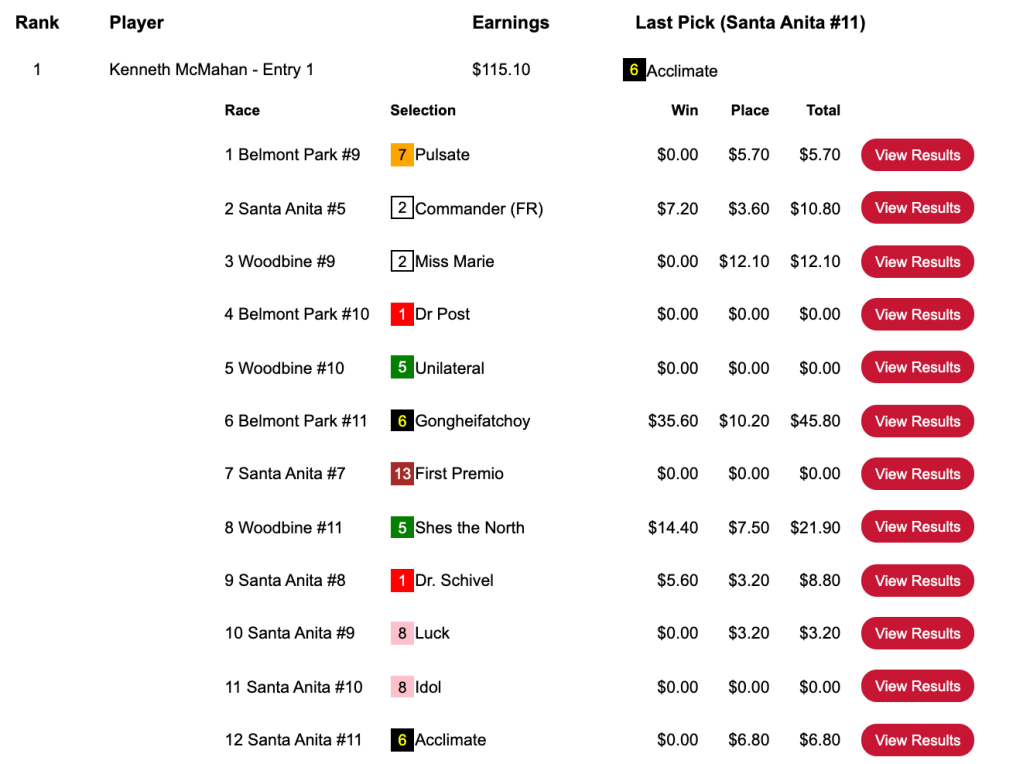 Gongheifatchoy plus 3 other winners and 4 runners up meant a $10,000 Breeders’ Cup Betting Challenge entry for McMahan in Saturday’s $179 qualifier at HorsePlayers.His score of $115.10 was a Saturday best.