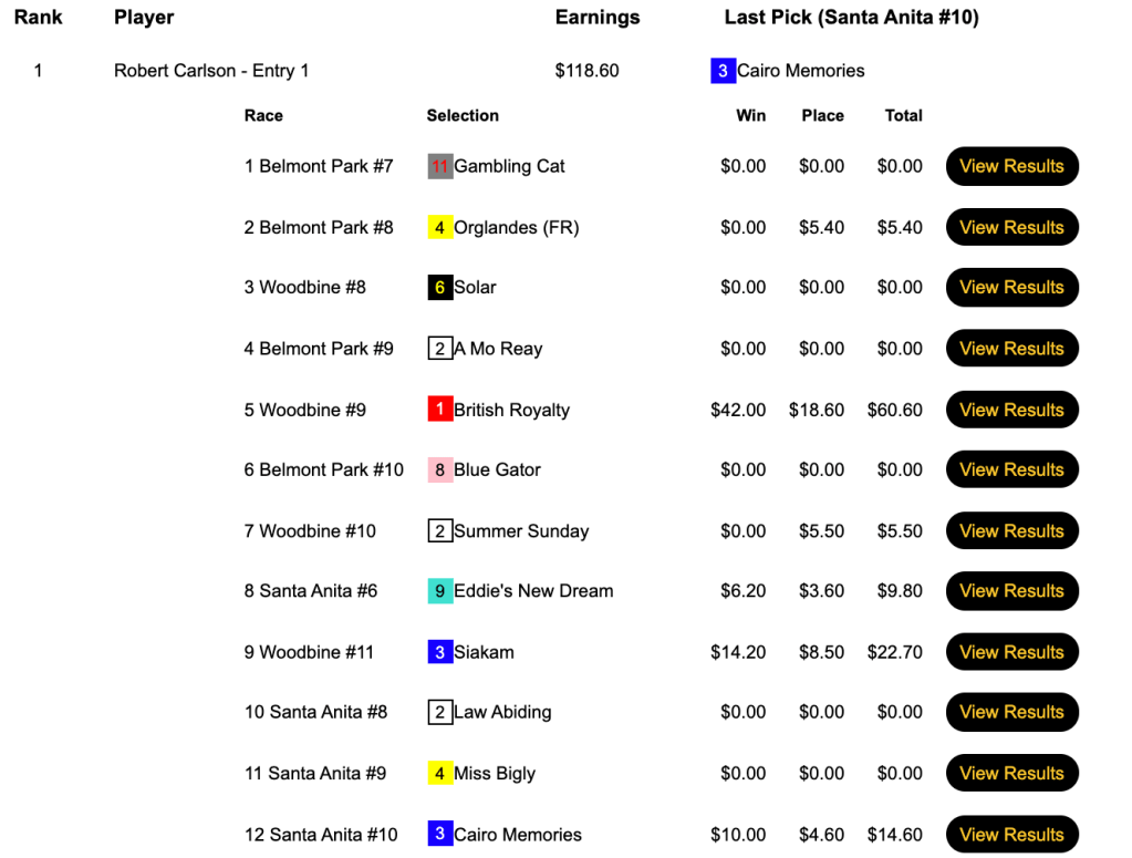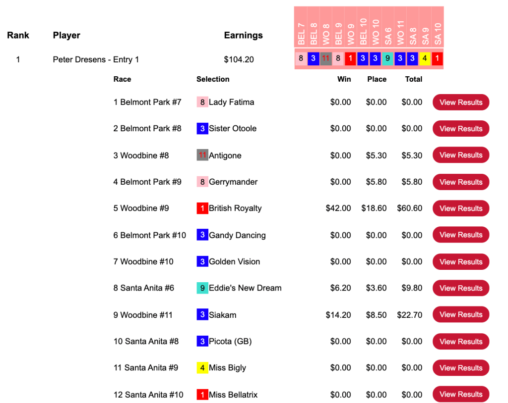 Addley had 5 firsts and 1 second, highlighted by British Royalty ($51.20, $18.60) in the 8th at Woodbine. His return was $10,561 in a game ultimately worth a total of $23,470.