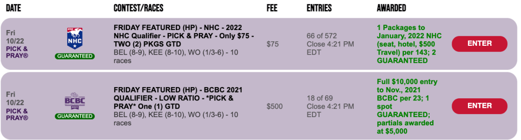 There’s also a $75 NHC Pick & Pray on Friday at HorsePlayers. It offers two guaranteed seats to the 2022 event as well as potentially valuable NHC Tour Points if you finish in the top 10 percent of the field. The winning ratio is 1-per-143. Remember—you must be a 2021 NHC Tour member, prior to the start of the contest, in order to be eligible for an NHC package in this or any other NHC qualifier. If you’re not a member, you can become one quickly and easily at NTRA.com for a $50 membership fee.