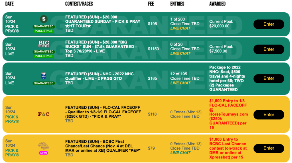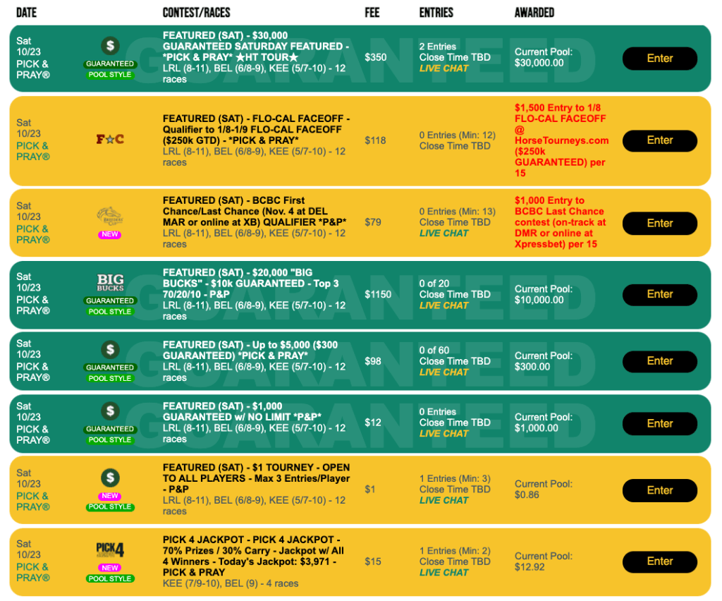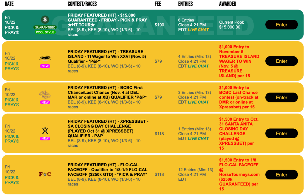 Since last week was a “Live-format” weekend at HorseTourneys, this week is a “Pick & Pray” weekend with all five features here operating under the “set-it-and-forget-it” parameters.