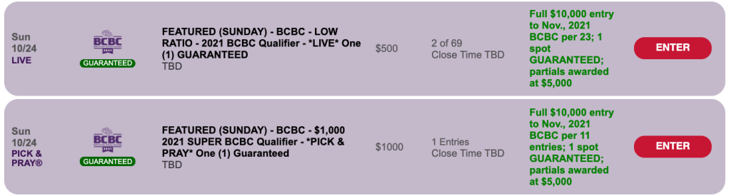 Or…you could double your theoretical chances by doubling your (non-theoretical) entry fee. Our Super Low Ratio BCBC Pick & Pray, costs $1,000 per entry, and the winning ratio is 1-per-11. Again, one seat is guaranteed.