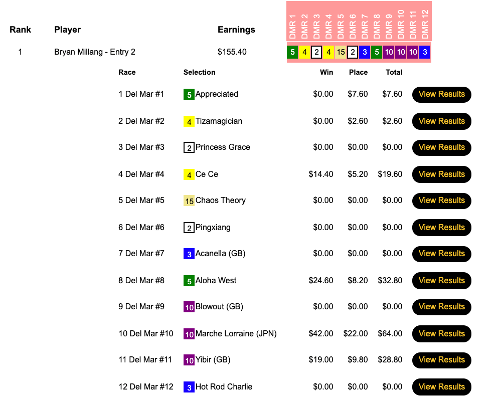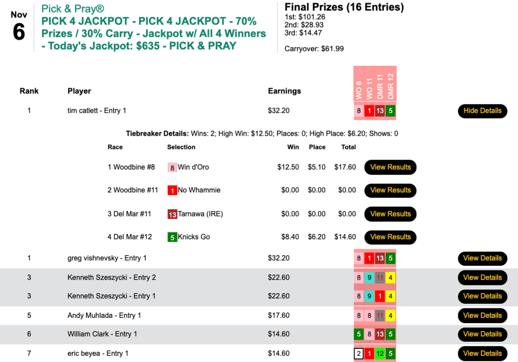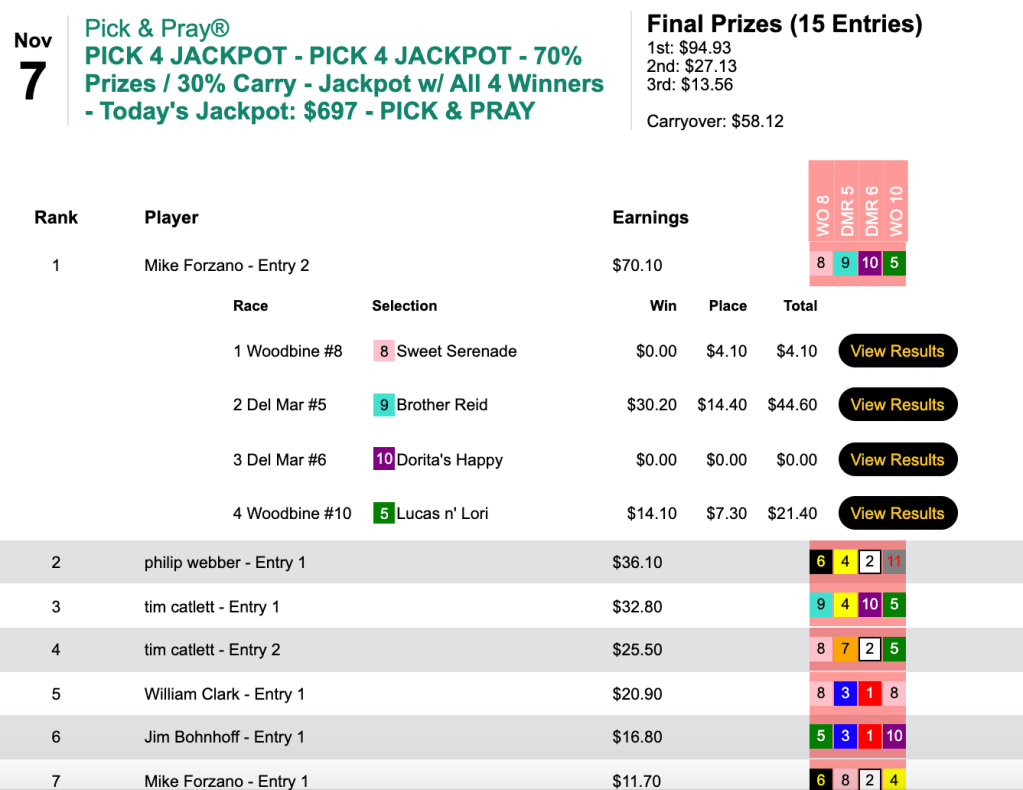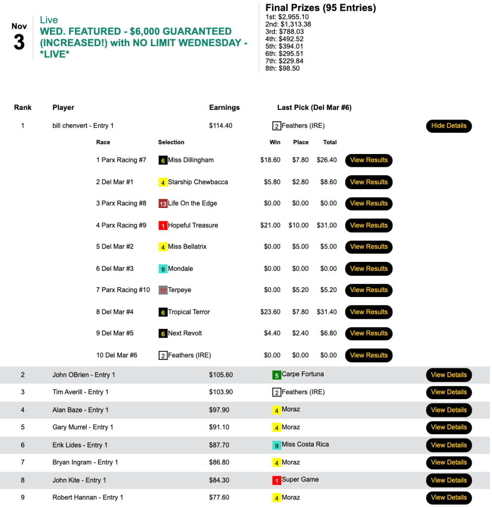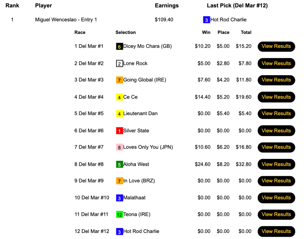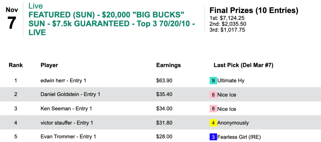 There was also a $10,000 Guaranteed Big Bucks Pick & Pray on Saturday that focused purely on the 12 races from Del Mar.