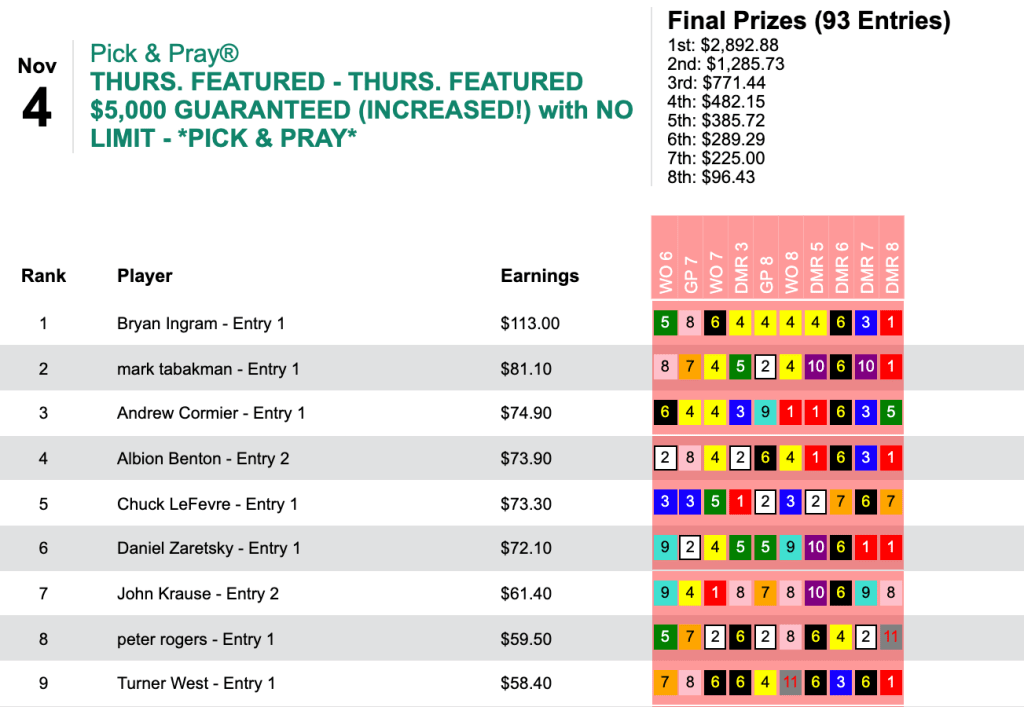 The winner of Thursday’s marquee cash game, a $5,000 Guaranteed Pick & Pray, was Bryan Ingram.