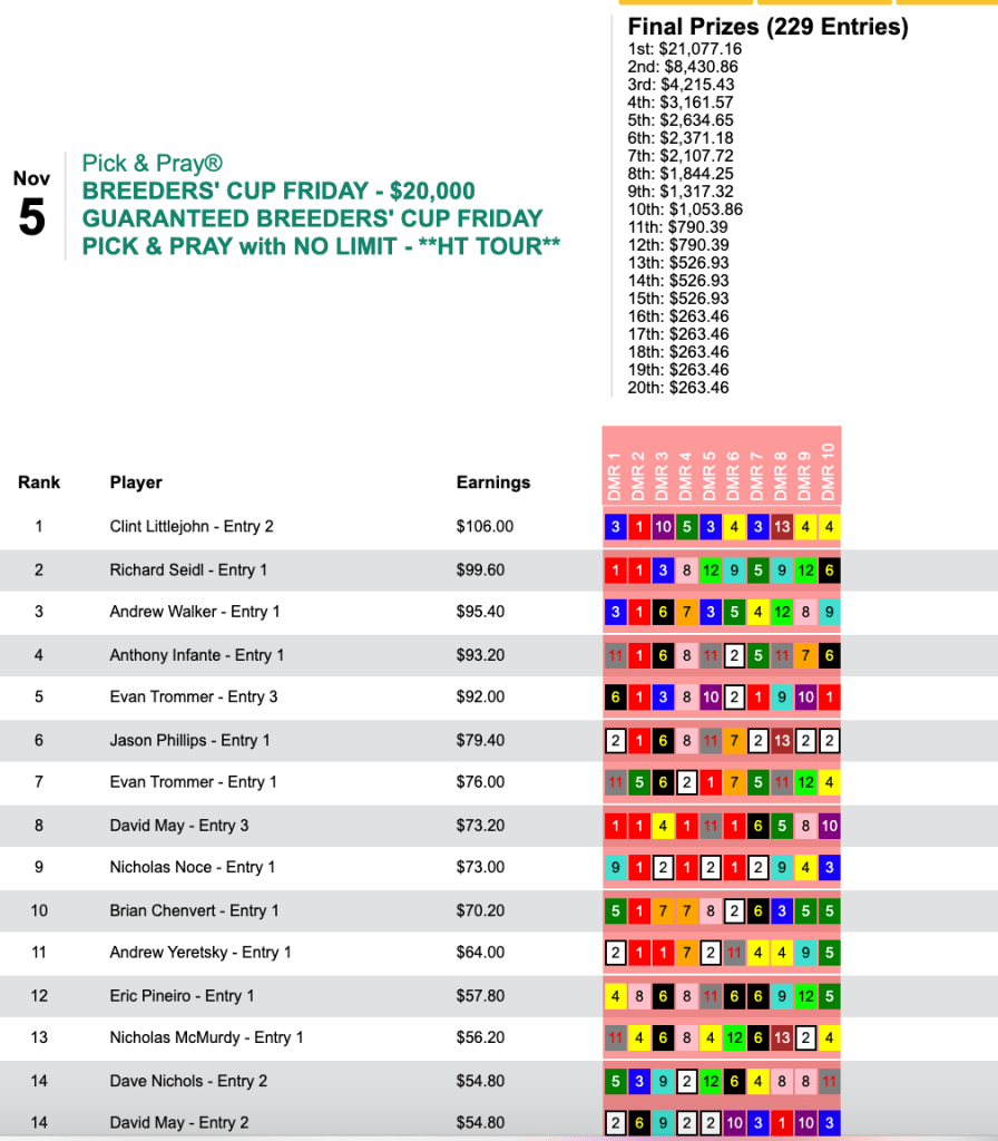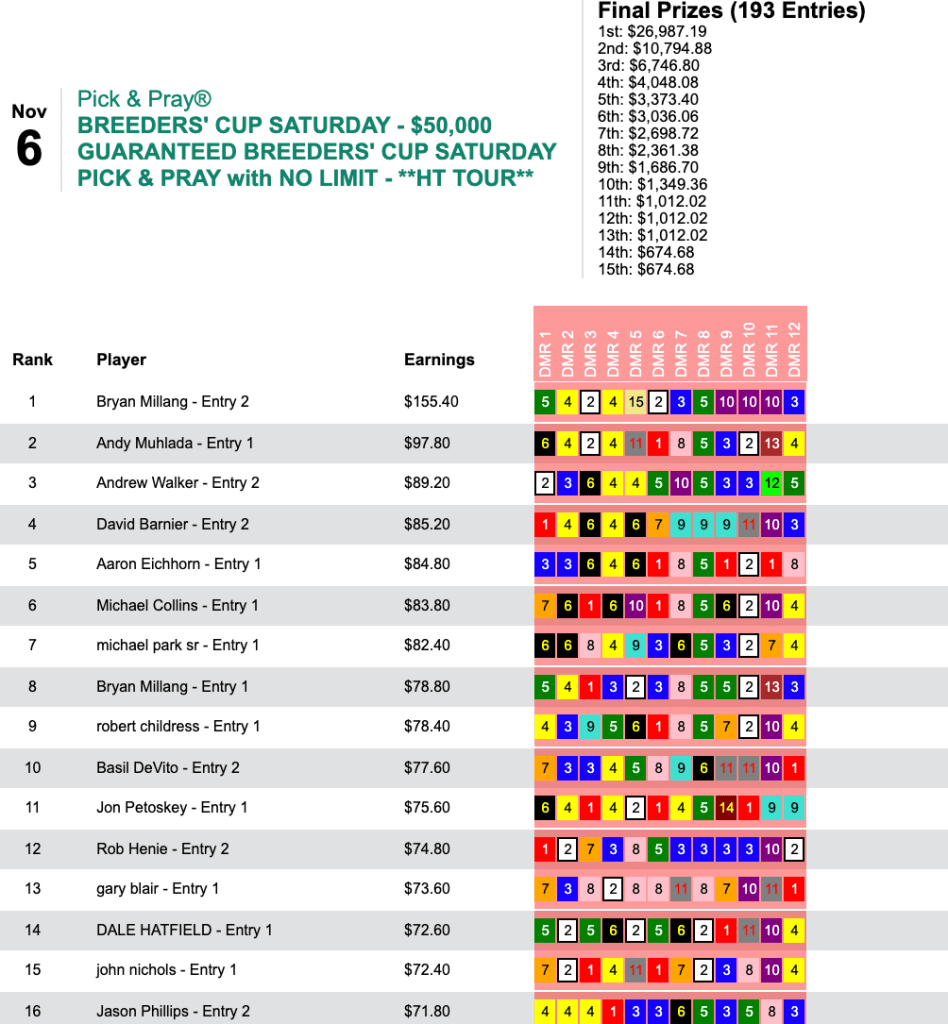 Sticking with the big-money Breeders’ Cup cash tourneys—more or less in descending order of value—Bryan Milang earned $26,987 in Saturday’s $50,000 Guaranteed Pick & Pray, which closed its doors with a pot of $67,467.