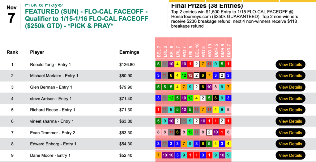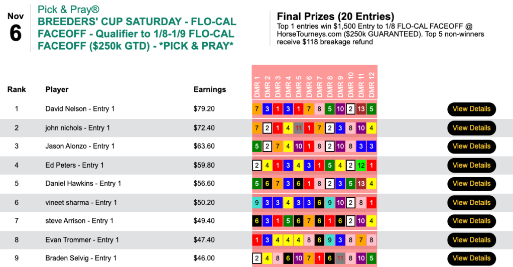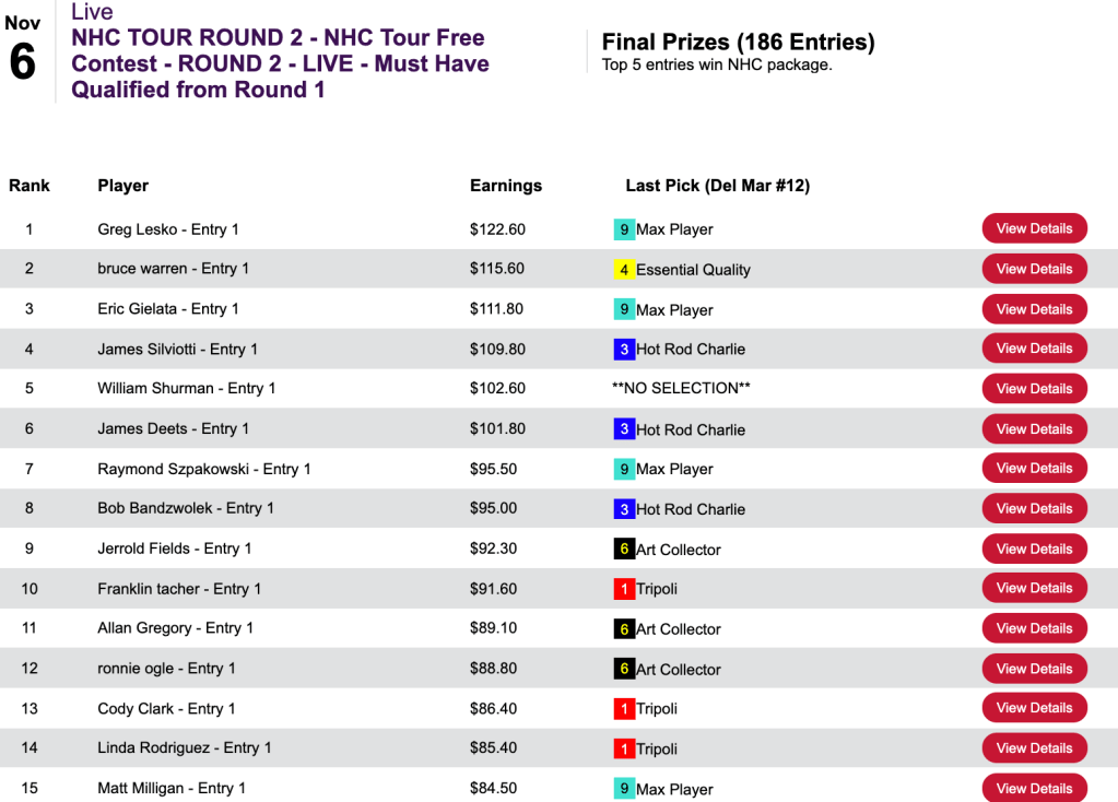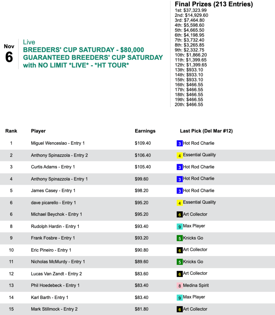 Moving back (or forward, depending on how you look at it) to Breeders’ Cup Saturday, we saw the culmination of a 2-day, free NHC qualifier at HorsePlayers.