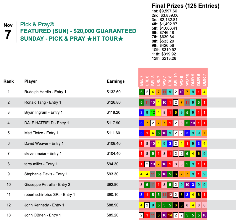 In fact, he had the high-score of the day in Sunday’s HT Tour event, our $20,000 Guaranteed Pick & Pray, to grab the winner’s share of $9,597 from the final pot of $21,328. Here’s a look at his scoresheet: