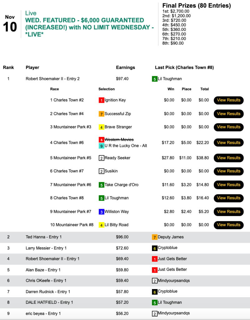 By the clock, the final race in this one turned out to be the 8th at Charles Town. Sacks (4 wins, 1 place) had Lil Toughman ($12.60, $3.80) in that one, and that moved Sacks up from 6th-place all the way to first.
