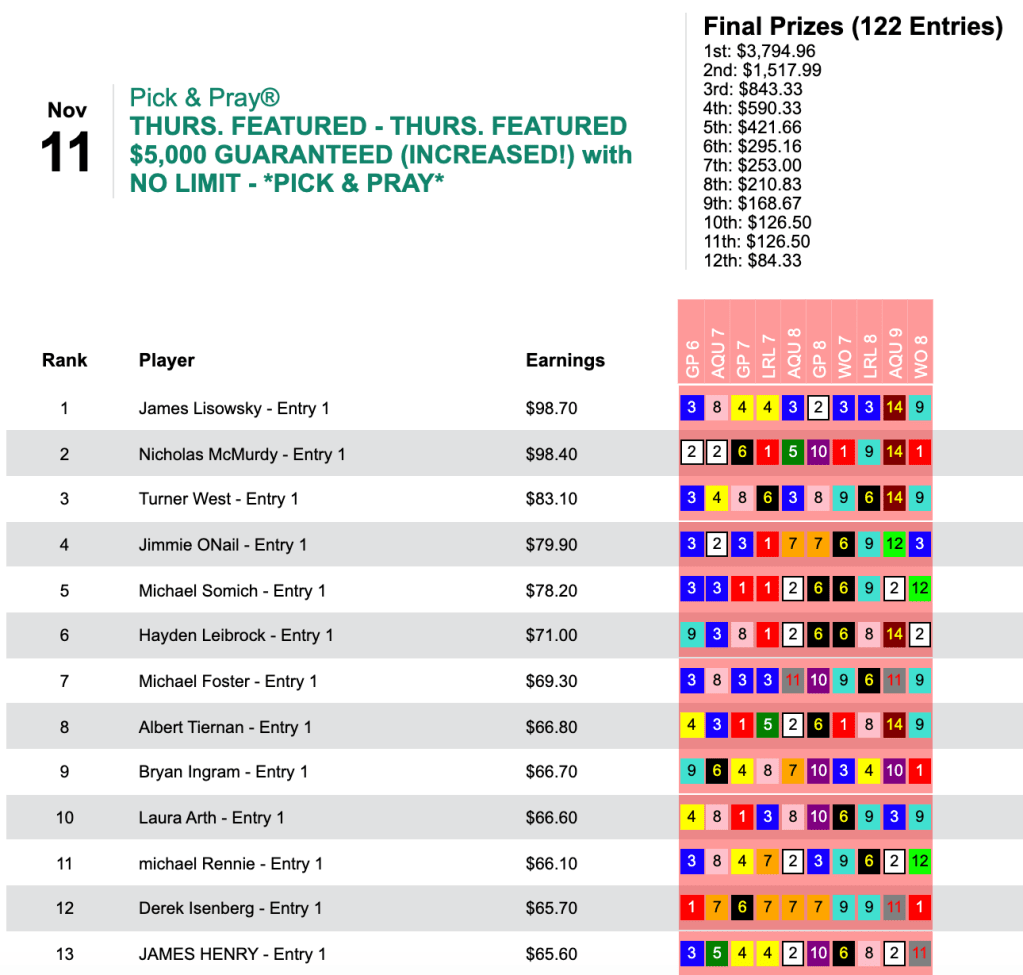On Saturday, James Lisowsky was winning his three tourneys, but he didn’t enter the $10,000 Guaranteed Big Bucks Pick & Pray. That left the door open for someone else to take home the $9,973 first prize.
