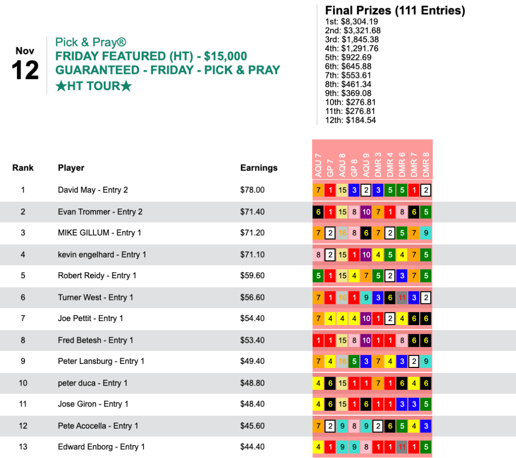 Similar to Lisowsky on Thursday, May rattled off three consecutive winners (including two $20+ horses) right from the outset of Friday’s $15,000 Guaranteed Pick & Pray (an HT Tour competition). A 3-2 winner late in the game sealed his victory, which brought him $8,304 from a game ultimately worth a total of $18,453.